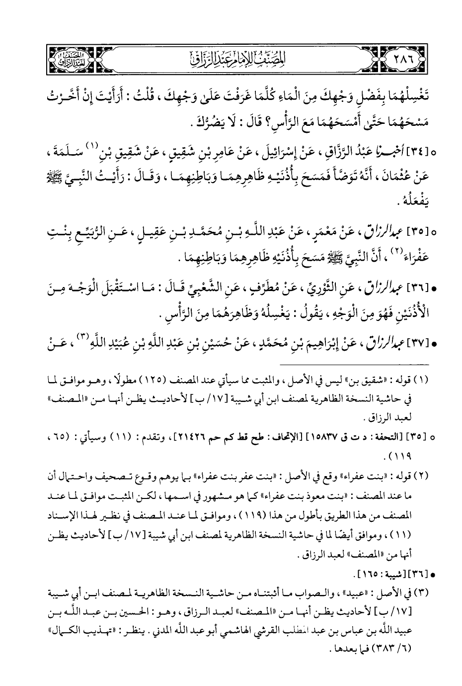° [٣٥] عبد الرزاق، عَنْ مَعْمَرٍ، عَنْ عَبْدِ اللَّهِ بْنِ مُحَمَّدِ بْنِ عَقِيلٍ، عَنِ الرُّبَيِّعِ بِنْتِ عَفْرَاءَ (¬٢)، أنَّ النَّبِيَّ - صلى الله عليه وسلم - مسَحَ بِأذُنَيْهِ ظاهِرِهِمَا وَبَاطِنِهِمَا.