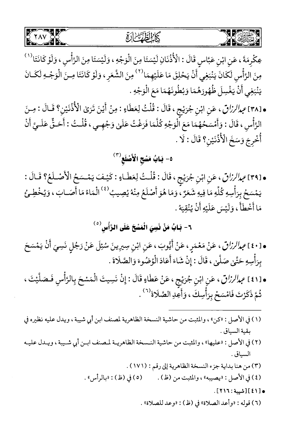 • [٤١] عبد الرزاق، عَنِ ابْنِ جُرَيْجٍ، عَنْ عَطَاءٍ قَالَ: إِنْ نَسِيتَ الْمَسْحَ بِالرَّأْسِ فَصَلَّيْتَ، ثُمَّ ذَكَرْتَ فَامْسَحْ بِرَأْسِكَ، وَأَعِدِ الصَّلَاةَ (¬٦).