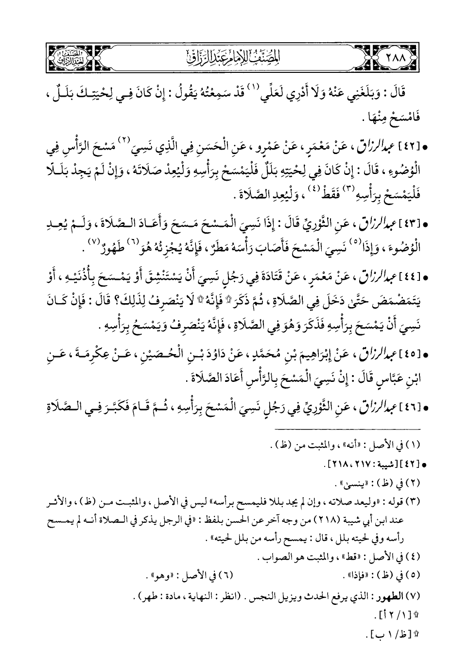 • [٤٣] عبد الرزاق، عَنِ الثَّوْريَّ قَالَ: إِذَا نَسِيَ الْمَسْحَ مَسَحَ وَأَعَادَ الصَّلَاةَ، وَلَمْ يُعِدِ الْوُضُوءَ، وإِذَا (¬٥) نَسِيَ الْمَسْحَ فَأَصَابَ رَأْسَهُ مَطَرٌ، فَإِنَّهُ يُجْزِئُهُ هُوَ (¬٦) طَهُورٌ (¬٧).