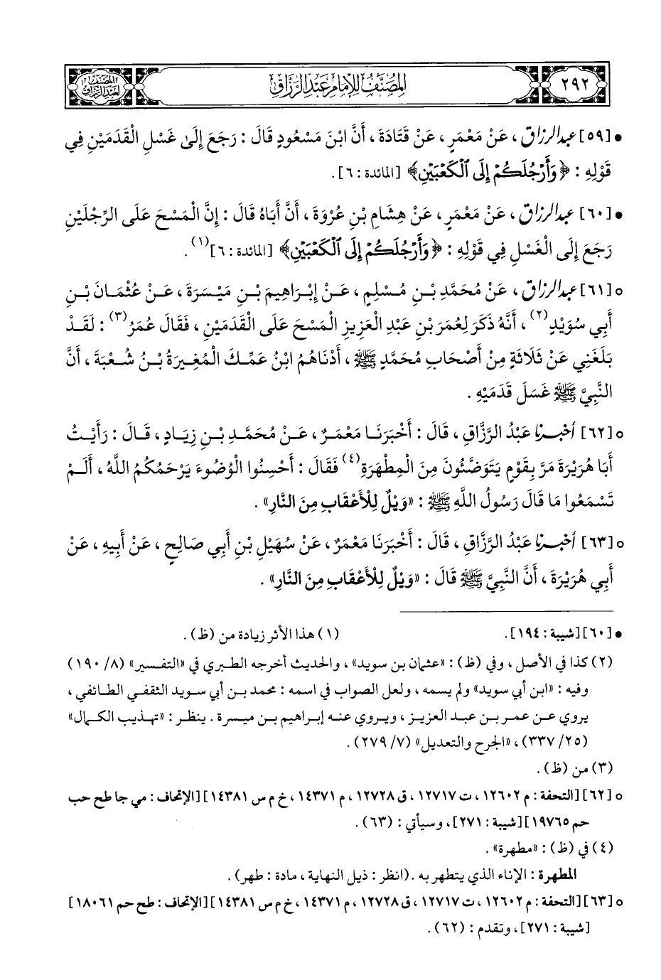 ° [٦٣] أخبرنا عَبْدُ الرَّزَّاقِ، قَالَ: أَخْبَرَنَا مَعْمَرٌ، عَنْ سُهَيْلِ بْنِ أَبِي صَالِحٍ، عَنْ أَبِيهِ، عَنْ أَبِي هُرَيْرَةَ، أَنَّ النَّبِيَّ - صلى الله عليه وسلم - قالَ: "وَيْلٌ لِلْأَعْقَابِ مِنَ النَّارِ".