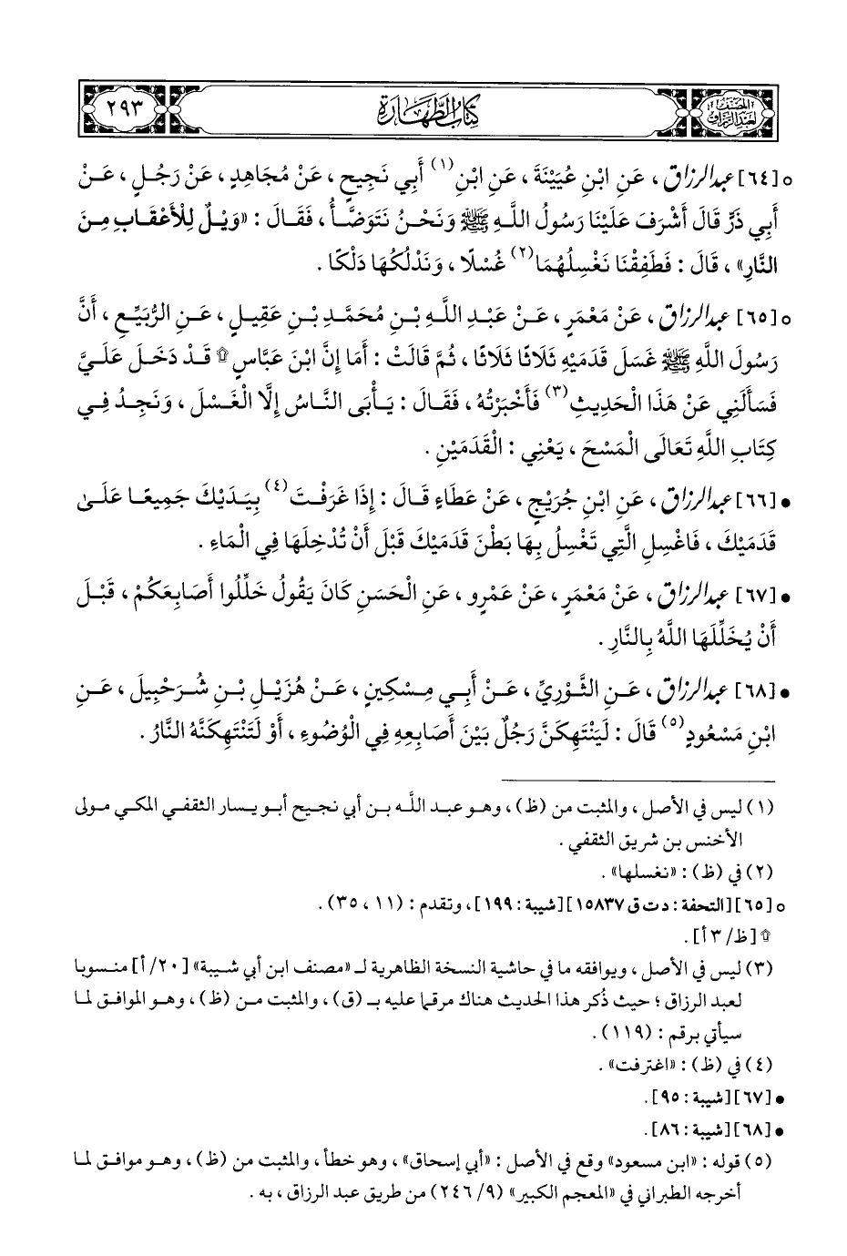 • [٦٨] عبد الرزاق، عَنِ الثَّوْرِيِّ، عَنْ أَبِي مِسْكِينٍ، عَنْ هُزَيْلِ بْنِ شُرَحْبِيلَ، عَنِ ابْنِ مَسْعُودٍ (¬٥) قالَ: لَيَنْتَهِكَنَّ رَجُلٌ بَيْنَ أَصَابِعِهِ فِي الْوُضُوءِ، أَوْ لَتَنْتَهِكَنَّهُ النَّارُ.