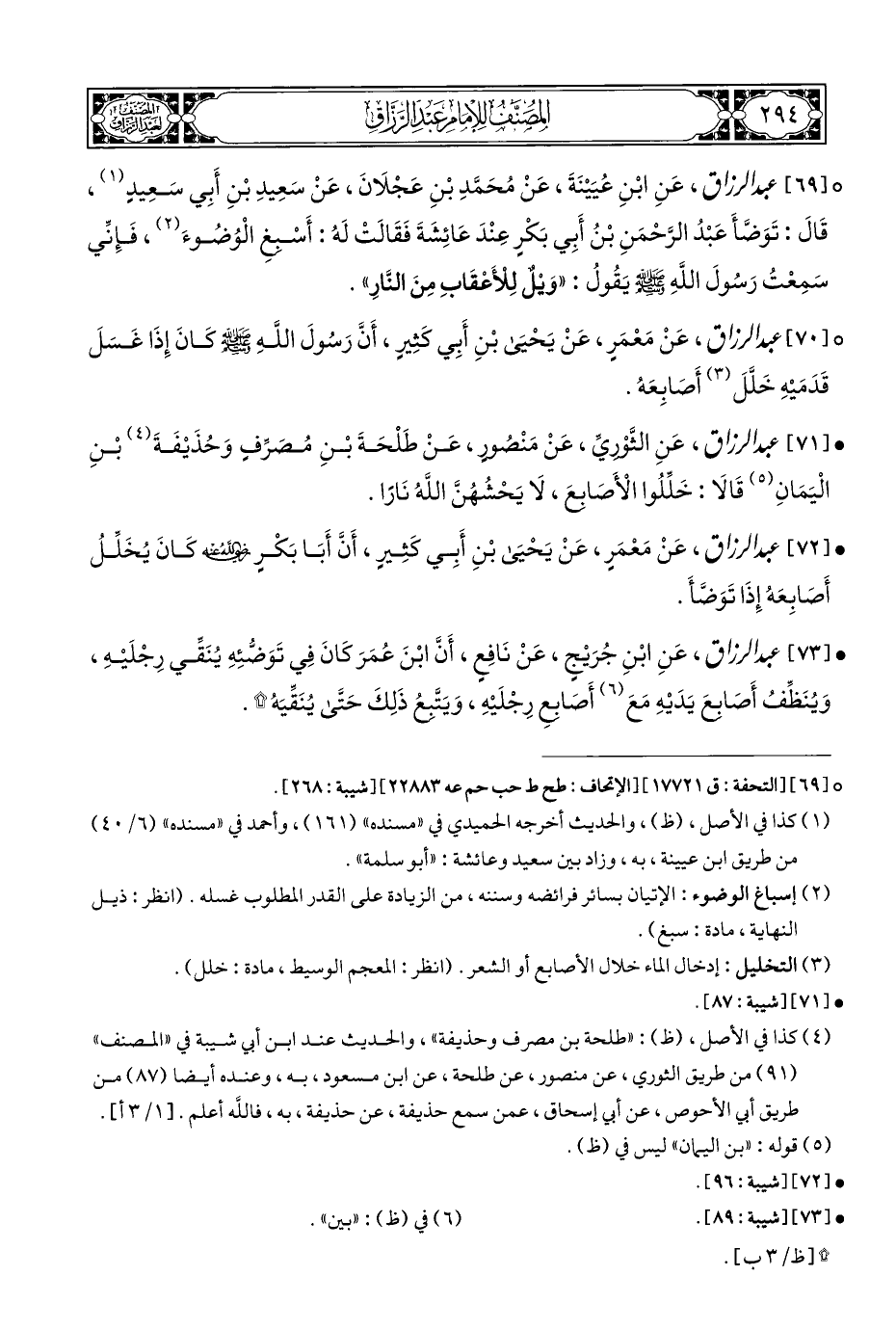 • [٧١] عبد الرزاق، عَنِ الثَّوْرِيِّ، عَنْ مَنْصُورٍ، عَنْ طَلْحَةَ بْنِ مُصَرَّفٍ وَحُذَيْفَةَ (¬٤) بْنِ الْيَمَانِ (¬٥) قَالَا: خَلِّلُوا الْأَصابعَ، لَا يَحْشُهُنَّ اللَّهُ نَارًا.