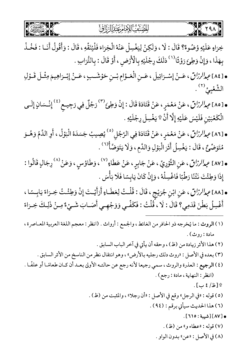 • [٨٨] عبد الرزاق، عَنِ ابْنِ جُرَيْجٍ، قَالَ: قُلْتُ لِعَطَاءٍ أَرَأَيْتَ إِنْ وَطِئْتُ خِرَاءً يَابِسًا، أَغْسِلُ بَطْنَ قَدَمِي؟ قَالَ: لَا، قُلْتُ: فَكَفِّي وَوَجْهِي إصَابَ شَييءٌ مِنْ ذَلِكَ خِرَاءَ
