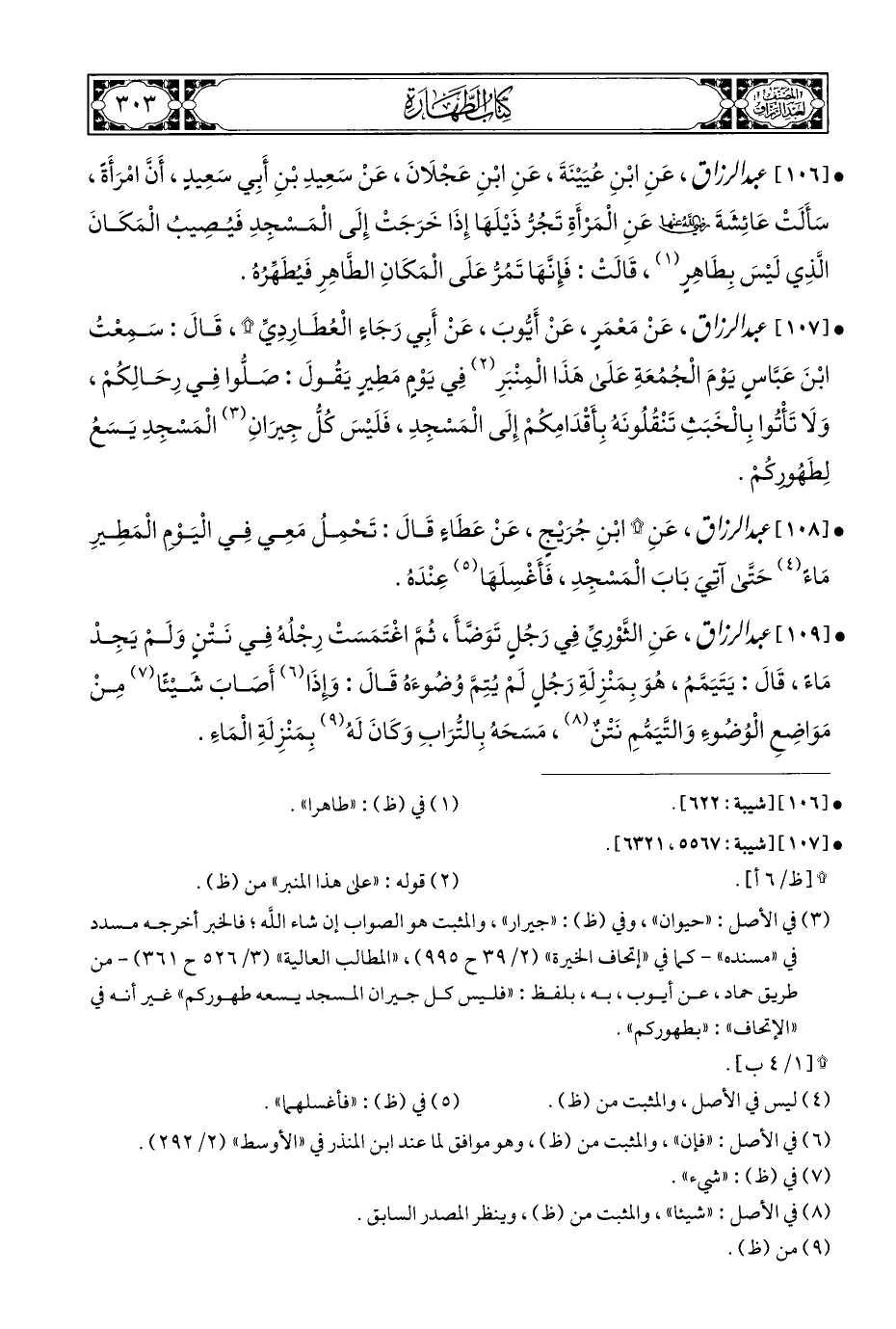(¬٣) في الأصل: "حيوان"، وفي (ظ): "جيرار"، والمثبت هو الصواب إن شاء الله؛ فالخبر أخرجه مسدد في "مسنده" - كما في "إتحاف الخيرة" (٢/ ٣٩ ح ٩٩٥)، "المطالب العالية" (٣/ ٥٢٦ ح ٣٦١) - من طريق حماد، عن أيوب، به، بلفظ: "فليس كل جيران المسجد يسعه طهوركم" غير أنه في "الإتحاف": "بطهوركم".