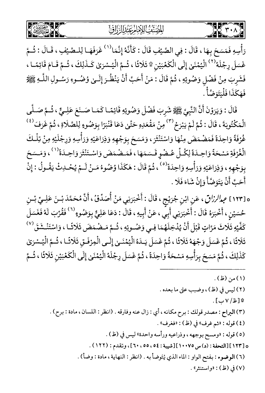 ° [١٢٣] عبد الرزاق، عَنِ ابْنِ جُرَيْجٍ، قَالَ: أَخْبَرَنِي مَنْ أُصَدِّقُ، أَنَّ مُحَمَّدَ بْنَ عَلِيِّ بْنِ حُسَيْنٍ، أَخْبَرَهُ قَالَ: أَخْبَرَنِي أَبِي، عَنْ أَبِيهِ، قَالَ: دَعَا عَلِيٌّ بِوَضُوءٍ (¬٦) فَقُرِّبَ لَهُ فَغَسَلَ كَفَّيْهِ ثَلَاثَ مَرَّاتٍ قَبْلَ أَنْ يُدْخِلَهُمَا فِي وَضُوئِهِ، ثُمَّ مَضْمَضَ ثَلَاثًا، وَاسْتَنْشَقَ (¬٧) ثَلَاثًا، ثُمَّ غَسَلَ وَجْهَهُ ثَلَاثًا، ثُمَّ غَسَلَ يَدَهُ الْيُمْنَى إِلَى الْمِرْفَقِ ثَلَاثًا، ثُمَّ الْيُسْرَى كَذَلِكَ، ثُمَّ مَسَحَ بِرَأْسِهِ مَسْحَةً وَاحِدَةً، ثُمَّ غَسَلَ رِجْلَهُ الْيُمْنَى إِلَى الْكَعْبَيْنِ ثَلَاثًا، ثُمَّ