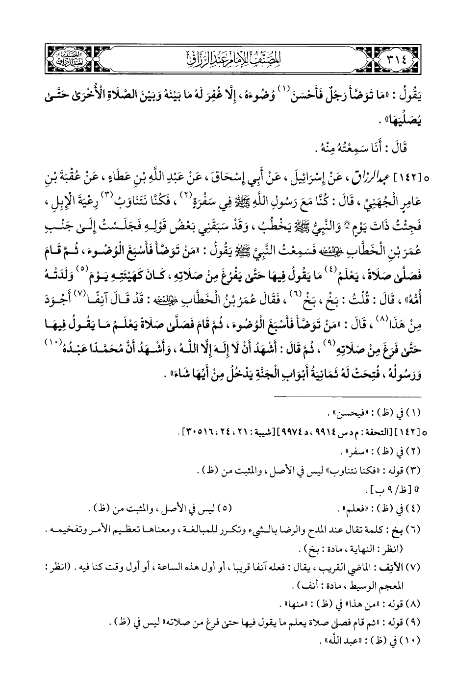 ° [١٤٢] عَبْدُ الرَّزَّاقِ، عَنْ إِسْرَائِيلَ، عَنْ أَبِي إِسْحَاقَ، عَنْ عَبْدِ اللَّهِ بْنِ عَطَاءٍ، عَنْ عُقْبَةَ بْنِ عَامِرٍ الْجُهَنِي، قَالَ: كُنَّا مَعَ رَسُولِ اللَّهِ - صلى الله عليه وسلم - في سَفْرَةٍ (¬٢)، فَكُنَّا نَتَنَاوَبُ (¬٣) رِعْيَةَ الْإِبِلِ، فَجِئْتُ ذَاتَ يَوْمٍ * وَالنَّبِيُّ - صلى الله عليه وسلم - يَخْطُبُ، وَقَدْ سَبَقَنِي بَعْضُ قَوْلِهِ فَجَلَسْتُ إِلَى جَنْبِ عُمَرَ بْنِ الْخَطَّابِ - رضي الله عنه - فَسَمِعْتُ النَّبِيَّ - صلى الله عليه وسلم - يَقُولُ: "مَنْ تَوَضَّأ فَأَسْبغَ الْوُضُوءَ، ثُمَّ قَامَ فَصَلَّى صَلَاة، يَعْلَمُ (¬٤) مَا يَقُولُ فِيهَا حَتَّى يَفْرُغَ مِنْ صَلَاتِهِ، كَانَ كَهَيْئَتِهِ يَوْمَ (¬٥) وَلَدَتْهُ أُمُّهُ"، قَالَ: قُلْتُ: بَخْ، بَخْ (¬٦)، فَقَالَ عُمَرُ بْنُ الْخَطَّابِ - رضي الله عنه -: قَدْ قَالَ آنِفًا (¬٧) أَجْوَدَ مِنْ هَذَا (¬٨)، قَالَ: "مَنْ تَوَضَّأَ فَأَسْبَغَ الْوُضُوءَ، ثُمَّ قَامَ فَصَلَّى صَلَاةً يَعْلَمُ مَا يَقُولُ فِيهَا حَتَّى فَرَغَ مِنْ صَلَاتِهِ (¬٩)، ثُمَّ قَالَ: أَشْهَدُ أَنْ لَا إِلَهَ إِلَّا اللهُ، وَأَشْهَدُ أَنَّ مُحَمَّدًا عَبْدُهُ (¬١٠) وَرَسُولُهُ، فُتِحَتْ لَهُ ثَمَانِيَةُ أَبوَابِ الْجَنَّةِ يَدْخُلُ مِنْ أَيِّهَا شَاءَ".