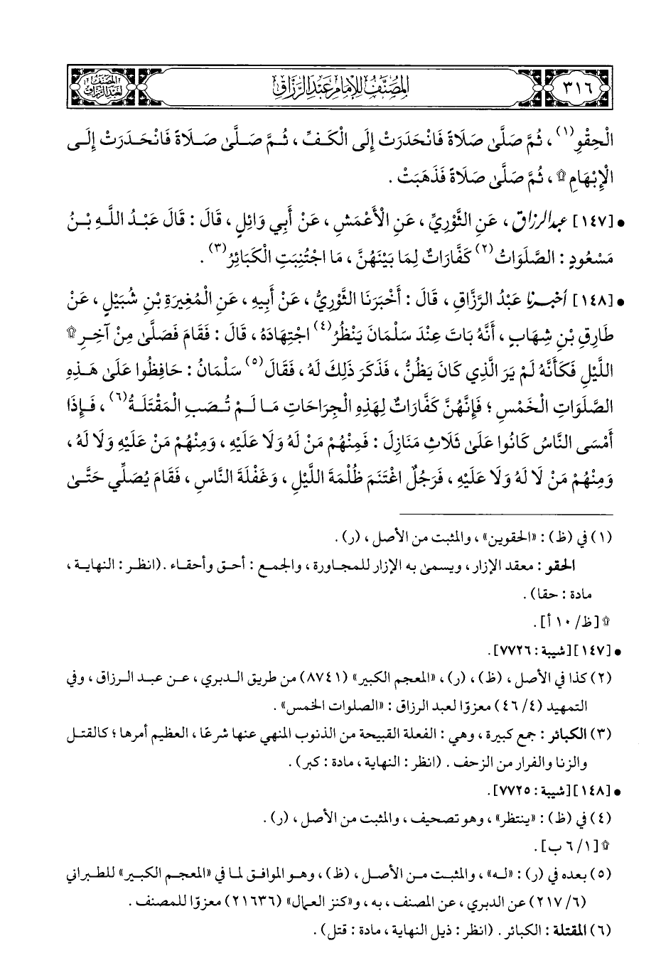 • [١٤٧] عَبْدُ الرَّزَّاقِ، عَنِ الثَّوْريِّ، عَنِ الْأَعْمَشِ، عَنْ أَبِي وَائِلٍ، قَالَ: قَالَ عَبْدُ اللَّهِ بْنُ مَسْعُودٍ: الصَّلَوَاتُ (¬٢) كَفَّارَاتٌ لِمَا بَيْنَهُنَّ، مَا اجْتُنِبَتِ الْكَبَائِرُ (¬٣).