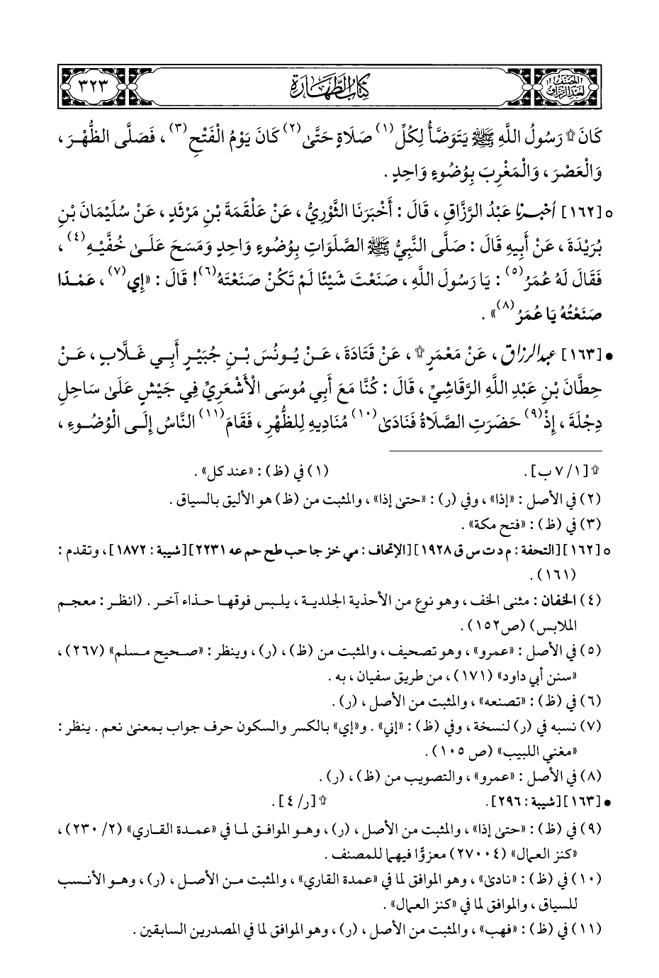 ° [١٦٢] أخبرنا عَبْدُ الرَّزَّاقِ، قَالَ: أَخْبَرَنَا الثَّوْريُّ، عَنْ عَلْقَمَةَ بْنِ مَرْثَدٍ، عَنْ سُلَيْمَانَ بْنِ بُرَيْدَةَ، عَنْ أَبيهِ قَالَ: صلَّى النَّبِيُّ - صلى الله عليه وسلم - الصَّلَوَاتِ بِوُضُوءٍ وَاحِدٍ وَمَسَحَ عَلَى خُفَّيْهِ (¬٤)، فَقَالَ لَهُ عُمَرُ (¬٥): يَا رَسُولَ اللَّهِ، صَنَعْتَ شَيْئًا لَمْ تَكُنْ صَنَعْتَهُ (¬٦)! قَالَ: "إِي (¬٧)، عَمْدًا صَنَعْتُهُ يَا عُمَرُ (¬٨) ".