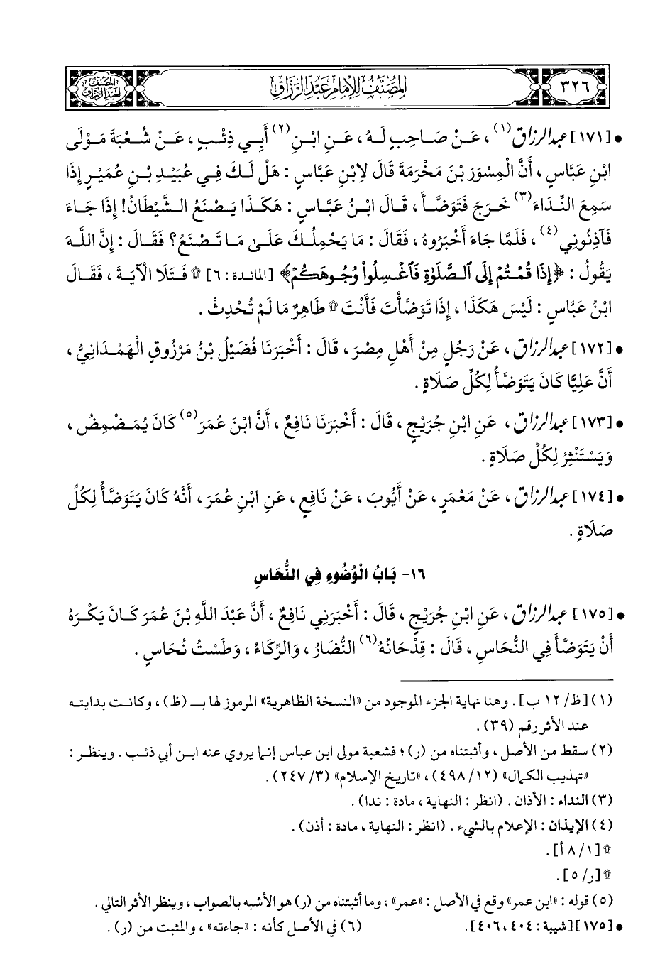 • [١٧١] عَبْدُ الرَّزَّاقِ، (¬١)، عَنْ صاحِبٍ لَهُ، عَنِ ابْنِ (¬٢) أَبِي ذِئْبٍ، عَنْ شُعْبَةَ مَوْلَى ابْنِ عَبَّاسِ، أَنَّ الْمِسْوَرَ بْنَ مَخْرَمَةَ قَالَ لاِبْنِ عَبَّاسِ: هَلْ لَكَ فِي عُبَيْدِ بْنِ عُمَيْرٍ إِذَا سَمِعَ النِّدَاءَ (¬٣) خَرَجَ فَتَوَضَّأَ، قَالَ ابْنُ عَبَّاسٍ: هَكَذَا يَصْنَعُ الشَّيْطَانُ! إِذَا جَاءَ فَآذِنُونِي (¬٤)، فَلَمَّا جَاءَ أَخْبَرُوهُ، فَقَالَ: مَا يَحْمِلُكَ عَلَى مَا تَصْنَعُ؟ فَقَالَ: إِنَّ اللَّهَ يَقُولُ: {إِذَا قُمْتُمْ إِلَى الصَّلَاةِ فَاغْسِلُوا وُجُوهَكُمْ} [المائدة: ٦] * فَتَلَا الْآيَةَ، فَقَالَ ابْنُ عَبَّاسٍ: لَيْسَ هَكَذَا، إِذَا تَوَضَّأْتَ فَأَنْتَ * طَاهِرٌ مَا لَمْ تُحْدِثْ.