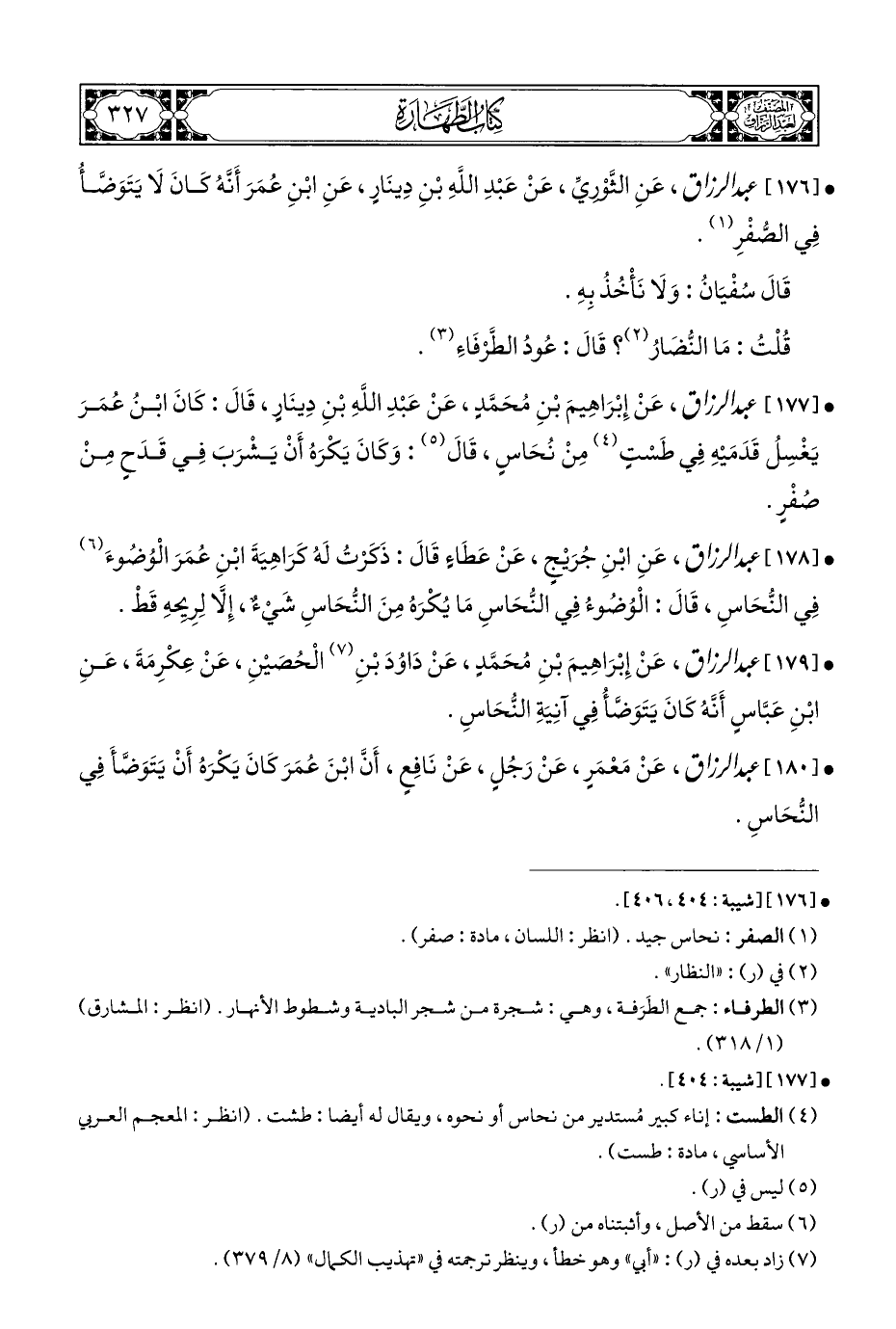 • [١٧٦] عَبْدُ الرَّزَّاقِ، عَنِ الثَّوْرِيِّ، عَنْ عَبْدِ اللَّهِ بْنِ دِينَارٍ، عَنِ ابْنِ عُمَرَ أَنَّهُ كَانَ لَا يَتَوَضَّأُ فِي الصُّفْرِ (¬١).