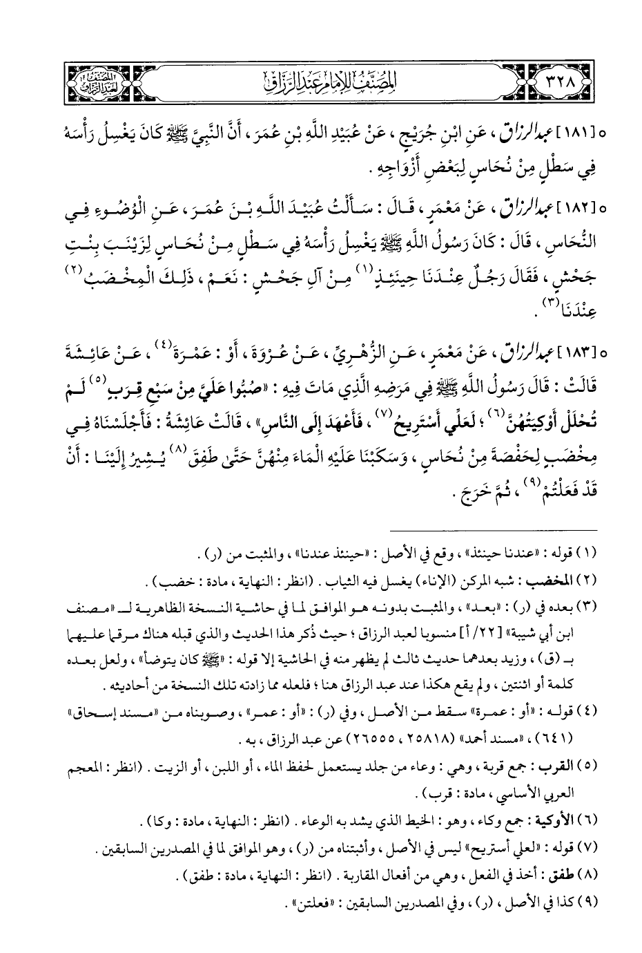 ° [١٨١] عَبْدُ الرَّزَّاقِ، عَنِ ابْنِ جُرَيْجٍ، عَنْ عُبَيْدِ اللَّهِ بْنِ عُمَرَ، أَنَّ النَّبِيَّ - صلى الله عليه وسلم - كَانَ يَغْسِلُ رَأْسَهُ فِي سَطْلٍ مِنْ نُحَاسٍ لِبَعْضِ أَزْوَاجِهِ.