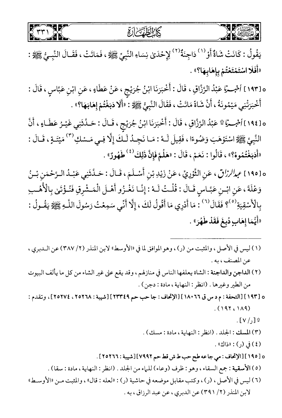 ° [١٩٣] أَخْبَرَنا عَبْدُ الرَّزَّاقِ، قَالَ: أَخْبَرَنَا ابْنُ جُرَيْجٍ، عَنْ عَطَاءٍ، عَنِ ابْنِ عَبَّاسٍ، قَالَ: أَخْبَرَتْنِي مَيْمُونَةُ، أَنَّ شَاةَ مَاتَتْ، فَقَالَ النَّبِيُّ - صلى الله عليه وسلم -: "أَلَا دَبَغْتُمْ إِهَابَهَا؟ ".