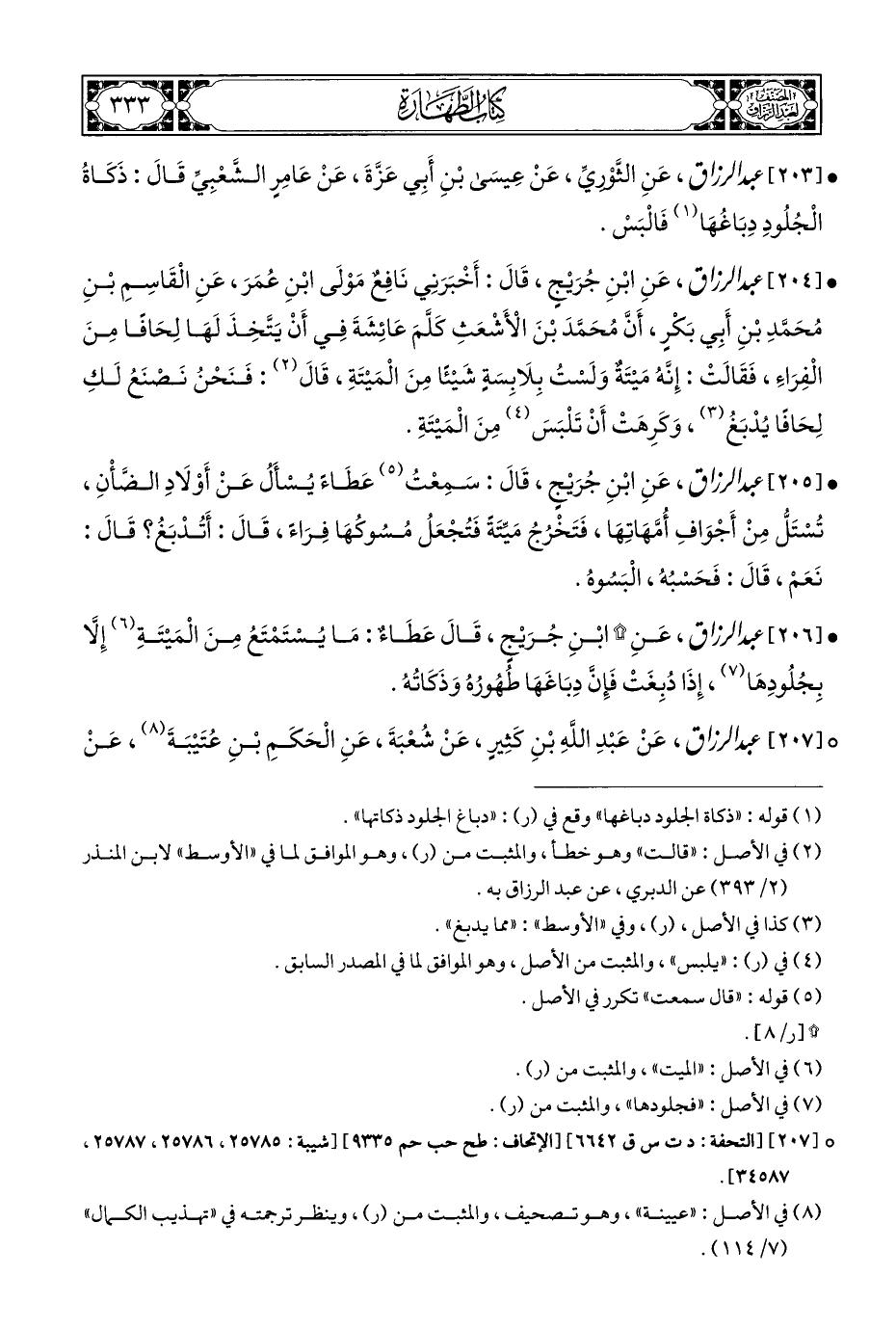 • [٢٠٣] عَبْدُ الرَّزَّاقِ، عَنِ الثَّوْرِيِّ، عَنْ عِيسَى بْنِ أَبِي عَزَّةَ، عَنْ عَامِرٍ الشَّعْبِيِّ قَالَ: ذَكَاةُ الْجُلُودِ دبَاغُهَا (¬١) فَالْبَسْ.