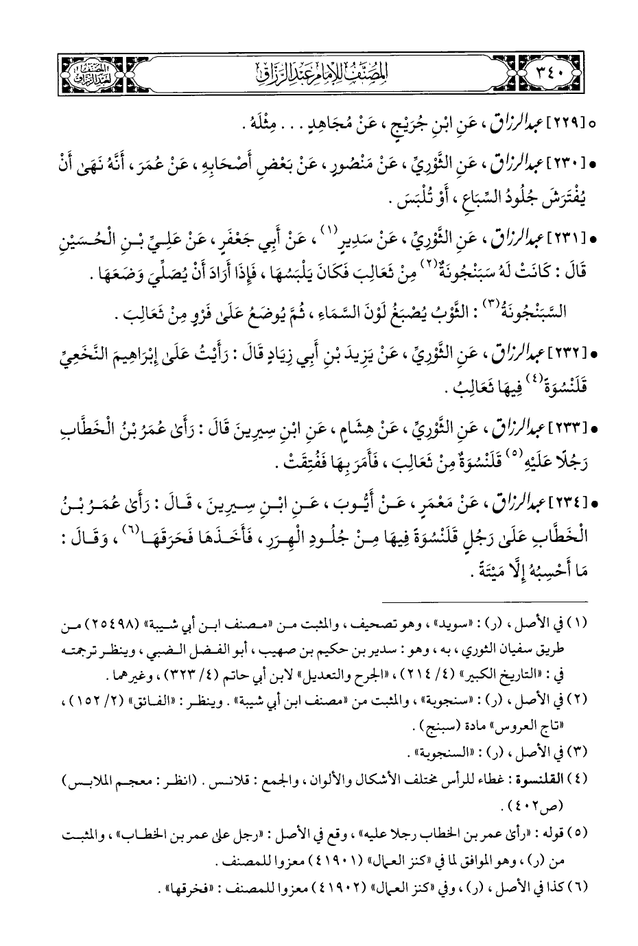 • [٢٣٣] عَبْدُ الرَّزَّاقِ، عَنِ الثَّوْريِّ، عَنْ هِشَامٍ، عَنِ ابْنِ سِيرِينَ قَالَ: رَأَى عُمَرُ بْنُ الْخَطَّابِ رَجُلًا عَلَيْهِ (¬٥) قَلَنْسُوَةٌ مِنْ ثَعَالِبَ، فَأَمَرَ بِهَا فَفُتِقَتْ.