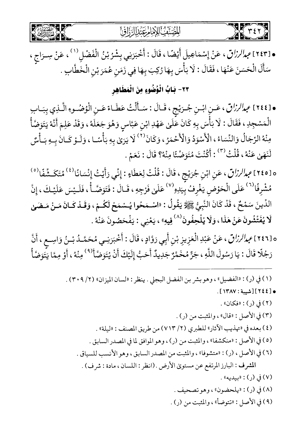 • [٢٤٤] عَبْدُ الرَّزَّاقِ، عَنِ ابْنِ جُرَيْجٍ، قَالَ: سَأَلْتُ عَطَاءً عَنِ الْوُضُوءِ الَّذِي بِبَابِ الْمَسْجِدِ، فَقَالَ: لَا بَأْسَ بِهِ كَانَ عَلَى عَهْدِ ابْنِ عَبَّاسٍ وَهُوَ جَعَلَهُ، وَقَدْ عَلِمَ أَنَّهُ يَتَوَضَّأُ مِنْهُ الرِّجَالُ وَالنِّسَاءُ، الْأَسْوَدُ وَالْأَحْمَرُ، وَكَانَ (¬٢) لَا يَرَى بِهِ بَأْسًا، وَلَوْ كَانَ بِهِ بَأْسٌ لَنَهَى عَنْهُ، قُلْتُ (¬٣): أَكُنْتَ مُتَوَضِّئًا مِنْهُ؟ قَالَ: نَعَمْ.