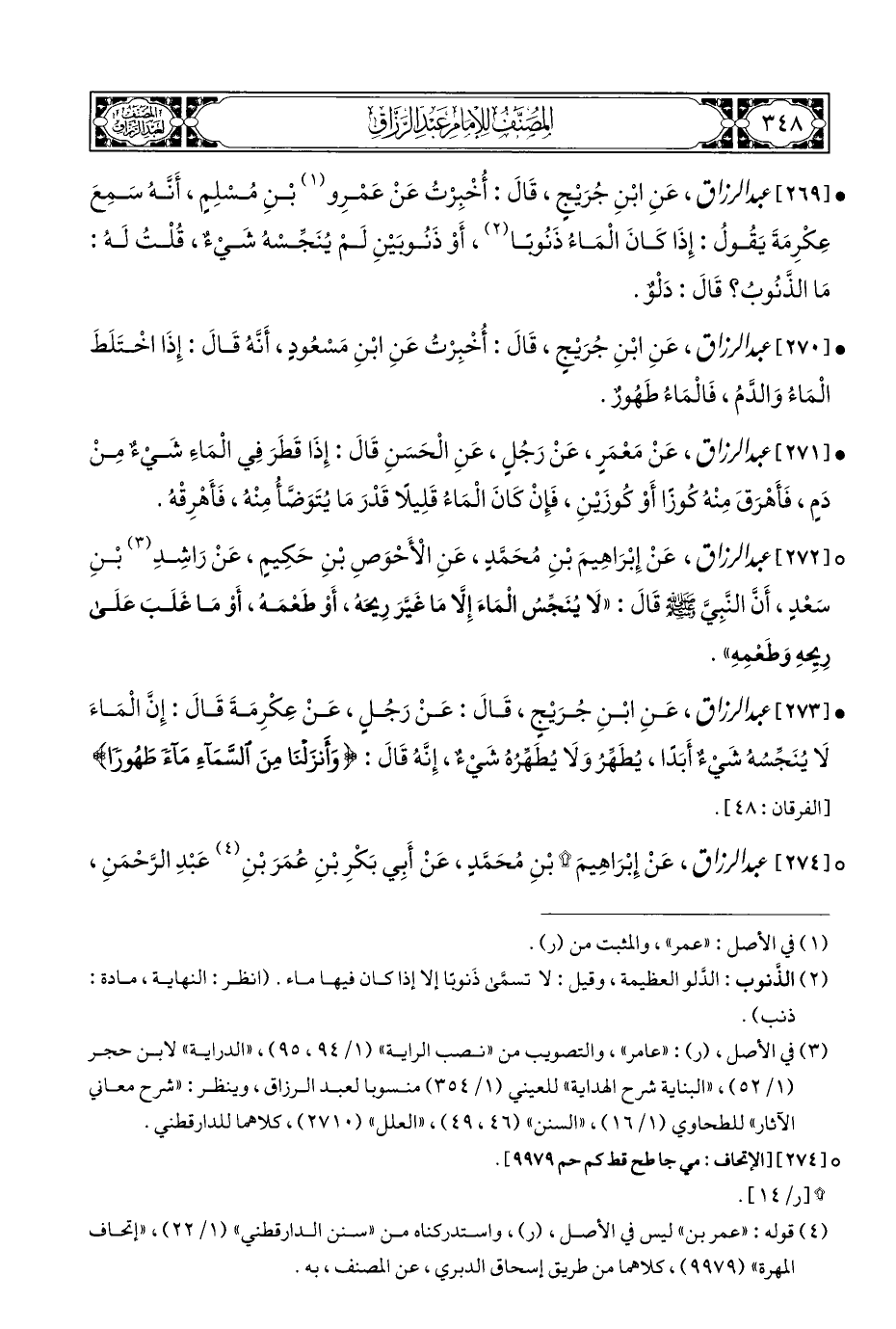 • [٢٧٠] عَبْدُ الرَّزَّاقِ، عَنِ ابْنِ جُرَيْجٍ، قَالَ: أُخْبِرْتُ عَنِ ابْنِ مَسْعُودٍ، أَنَّهُ قَالَ: إِذَا اخْتَلَطَ الْمَاءُ وَالدَّمُ، فَالْمَاءُ طَهُورٌ.
