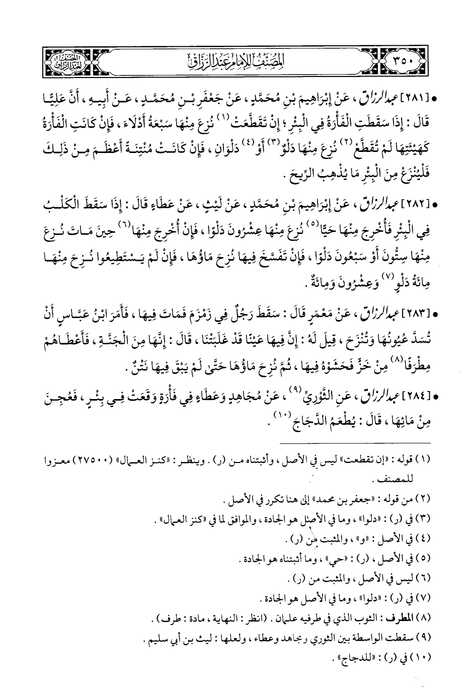 • [٢٨١] عبد الرازق، عَنْ إِبْرَاهِيمَ بْنِ مُحَمَّدٍ، عَنْ جَعْفَرِ بْنِ مُحَمَّدٍ، عَنْ أَبِيهِ، أَنَّ عَلِيًّا قَالَ: إِذَا سَقَطَتِ الْفَأْرَةُ فِي الْبِئْرِ؟ إِنْ تَقَطَّعَتْ (¬١) نُزِعَ مِنْهَا سَبْعَةُ أَدْلَاءَ، فَإِنْ كَانَتِ الْفَأْرَةُ كَهَيْئَتِهَا لَمْ تُقَطَّعْ (¬٢) نُزِعَ مِنْهَا دَلْوٌ (¬٣) أَوْ (¬٤) دَلْوَانِ، فَإِنْ كَانَتْ مُنْتِنَةً أَعْظَمَ مِنْ ذَلِكَ فَلْيُنْزَعْ مِنَ الْبِئْرِ مَا يُذْهِبُ الرِّيحَ.