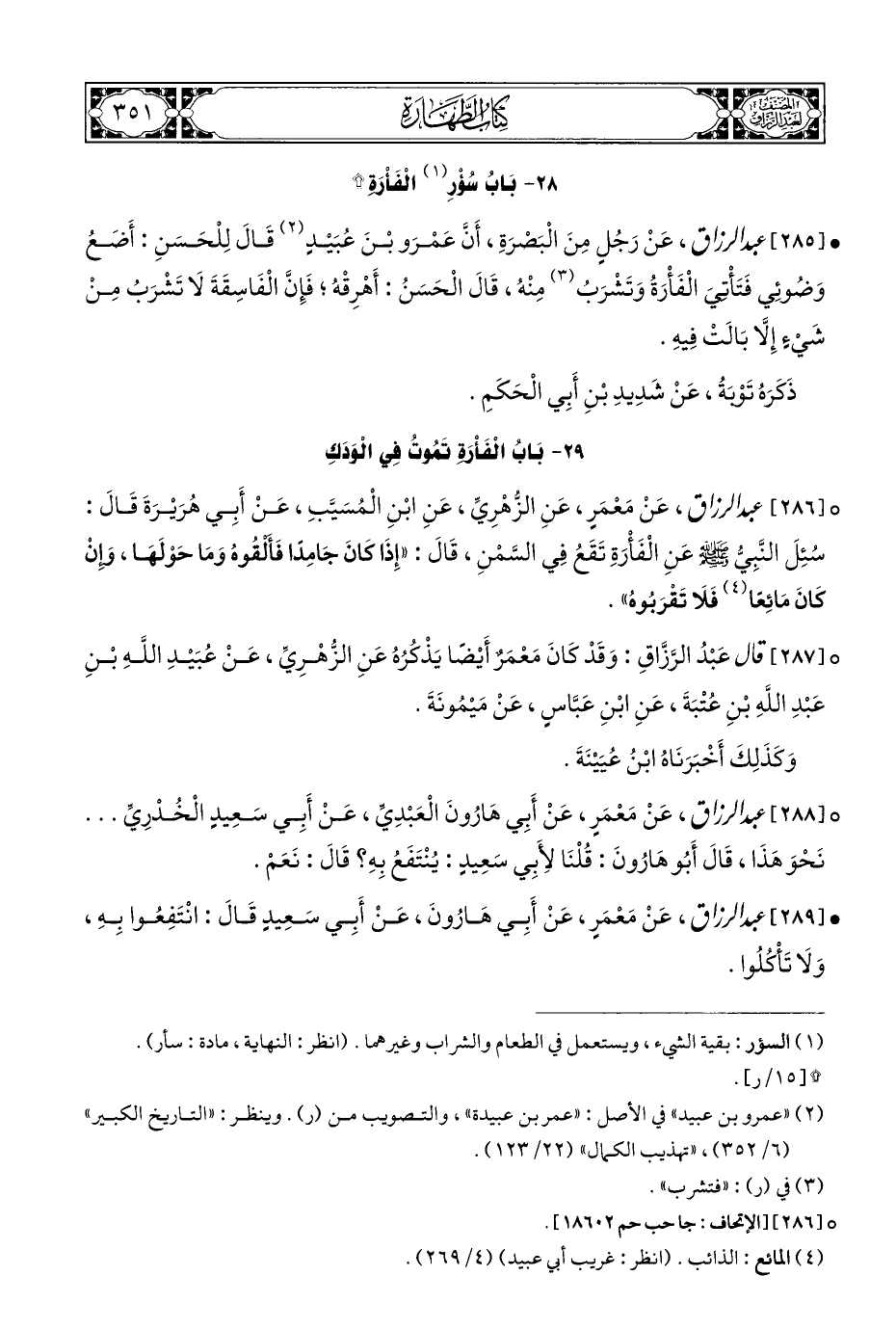 • [٢٨٥] عبد الرزاق، عَنْ رَجُلٍ مِنَ الْبَصْرَةِ، أَنَّ عَمْرَو بْنَ عُبَيْدٍ (¬٢) قَالَ لِلْحَسَنِ: أَضَعُ وَضُوئِي فَتَأْتيَ الْفَأْرَةُ وَتَشْرَبُ (¬٣) مِنْهُ، قَالَ الْحَسَنُ: أَهْرِقْهُ، فَإِنَّ الْفَاسِقَةَ لَا تَشْرَبُ مِنْ شَيءٍ إِلَّا بَالَتْ فِيهِ.