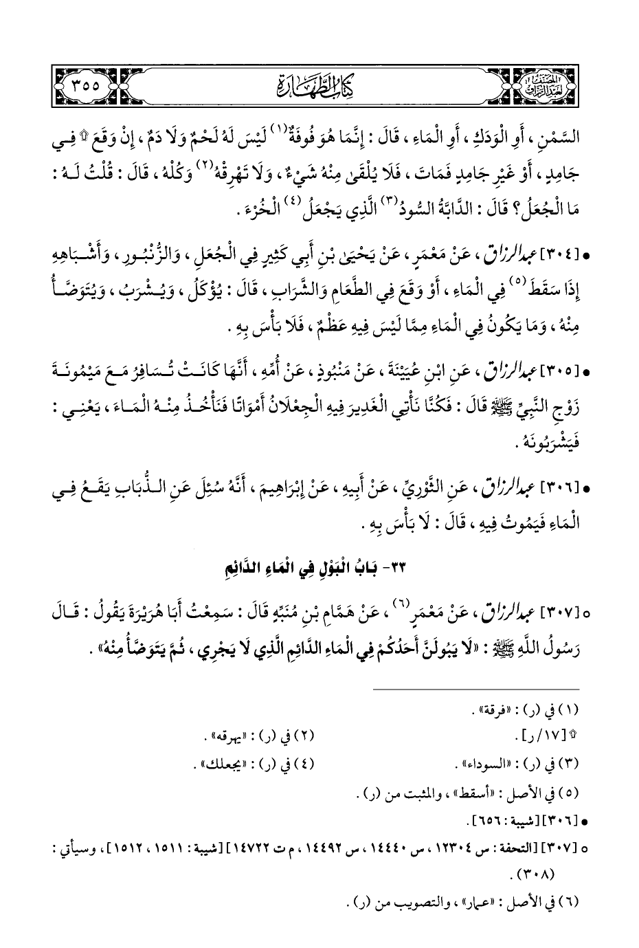 ° [٣٠٧] عبد الرزاق، عَنْ مَعْمَرٍ (¬٦)، عَنْ هَمَّامِ بْنِ مُنَبِّهٍ قَالَ: سَمِعْتُ أَبَا هُرَيْرةَ يَقُولُ: قَالَ رَسُولُ اللهِ - صلى الله عليه وسلم -:"لَا يَبُولَنَّ أَحَدُكُمْ فِي الْمَاءِ الدَّائِمِ الَّذِي لَا يَجْرِي، ثُمَّ يَتَوَضَّأُ مِنْهُ".