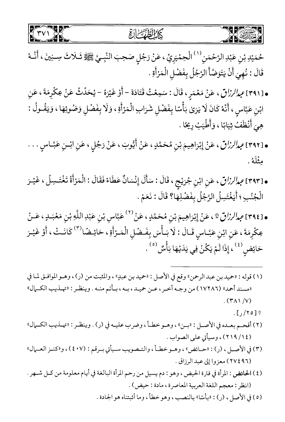 • [٣٩٤] عبد الرزاق *، عَنْ إِبْرَاهِيمَ بْنِ مُحَمَّدٍ، عَنْ (¬٢) عَبَّاسِ بْنِ عَبْدِ اللهِ بْنِ مَعْبَدٍ، عَنْ عِكْرِمَةَ، عَنِ ابْنِ عَبَّاسٍ قَالَ: لَا بَأْسَ بِفَضْلِ الْمَرْأَةِ، حَائِضًا (¬٣) كَانَتْ، أَوْ غَيْرَ حَائِضٍ (¬٤)، إِذَا لَمْ يَكُنْ فِي يَدَيْهَا بَأْسٌ (¬٥).