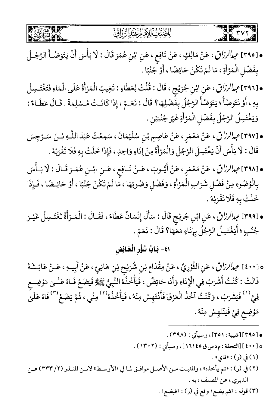 • [٤٠٠] عبد الرزاق، عَنِ الثَّوْريِّ، عَنْ مِقْدَامِ بْنِ شُرَيْحِ بْنِ هَانِئٍ، عَنْ أَبِيهِ، عَنْ عَائِشَةَ قَالَتْ: كُنْتُ أَشْرَبُ فِي الْإِنَاءِ وَأَنَا حَائِضٌ، فَيَأْخُذُهُ النَّبِيُّ - صلى الله عليه وسلم - فيَضَعُ فَاهُ عَلَى مَوْضِعِ فِيَّ (¬١) فَيَشْرَبُ، وَكُنْتُ آخُذُ الْعَرْقَ فَأَنْتَهِسُ مِنْهُ، فَيَأْخُذُهُ (¬٢) مِنِّي، ثُمَّ يَضَعُ (¬٣) فَاهُ عَلَى مَوْضِعِ فِيَّ فَيَنْتَهِسُ مِنْهُ.