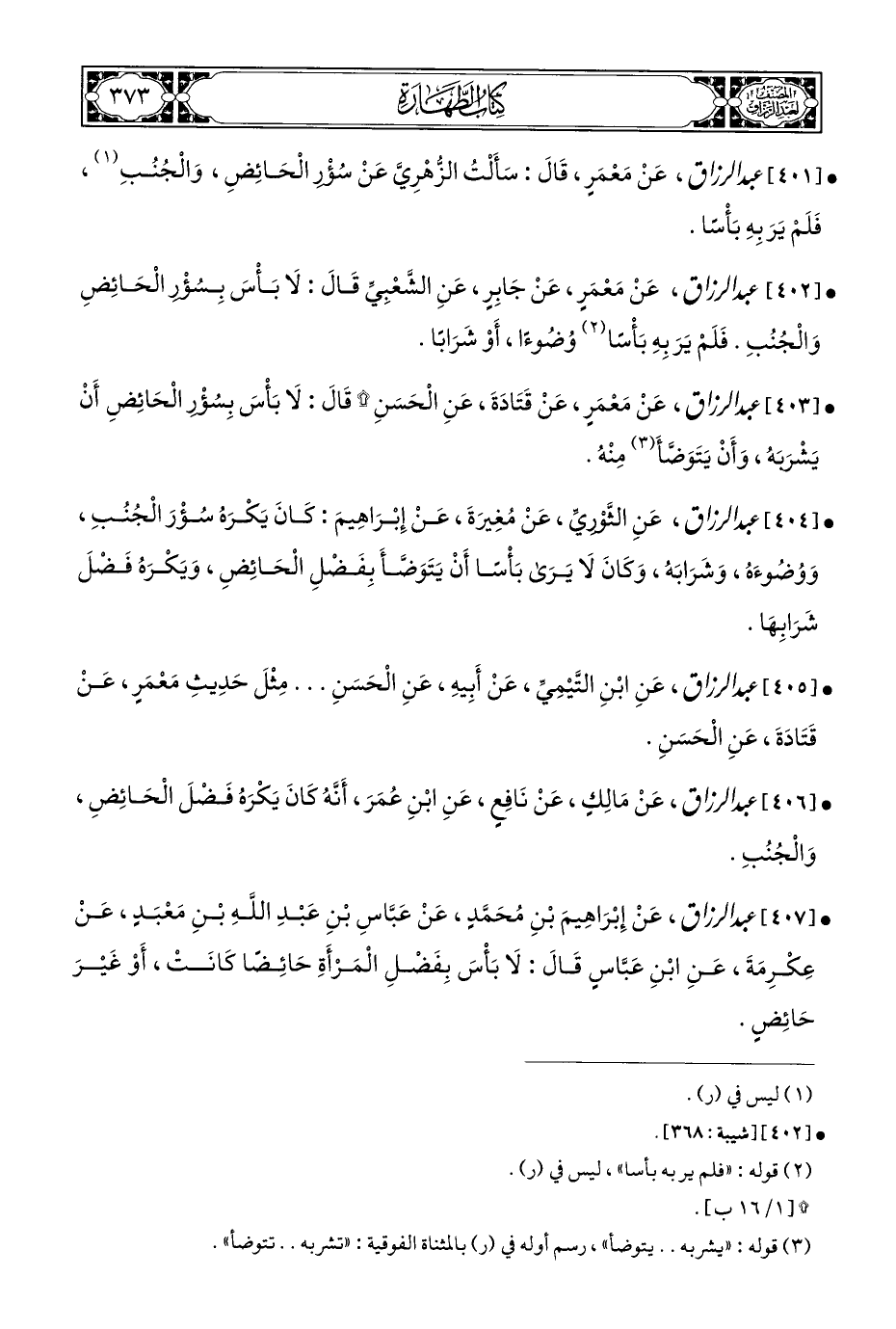 • [٤٠٢] عبد الرزاق، عَنْ مَعْمَرٍ، عَنْ جَابِرٍ، عَنِ الشَّعْبِيِّ قَالَ: لَا بَأْسَ بِسُؤْرِ الْحَائِضِ وَالْجُنُبِ. فَلَمْ يَرَ بِهِ بَأْسًا (¬٢) وُضُوءًا، أَوْ شَرَابًا.