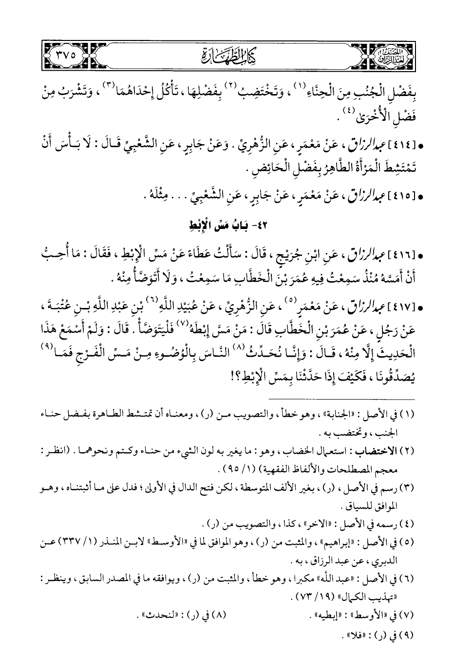 • [٤١٧] عبد الرزاق، عَنْ مَعْمَرٍ (¬٥)، عَنِ الزُّهْرِيِّ، عَنْ عُبَيْدِ اللهِ (¬٦) بْنِ عَبْدِ اللهِ بْنِ عُتْبَةَ، عَنْ رَجُلٍ، عَنْ عُمَرَ بْنِ الْخَطَّابِ قَالَ: مَنْ مَسَّ إِبْطَهُ (¬٧) فَلْيَتَوَضَّأْ. قَالَ: وَلَمْ أَسْمَعْ هَذَا الْحَدِيثَ إِلَّا مِنْهُ، قَالَ: وإنَّا نُحَدِّثُ (¬٨) النَّاسَ بِالْوُضوءِ مِنْ مَسِّ الْفَرْجِ فَمَا (¬٩) يُصَدِّقُونَا، فَكَيْفَ إِذَا حَدَّثْنَا بِمَسِّ الْإِبْطِ؟!