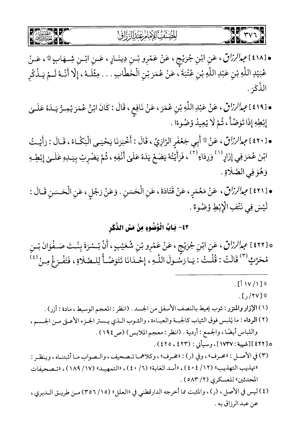 ° [٤٢٢] عبد الرزاق، عَنِ ابْنِ جُرَيْجٍ، عَنْ عَمْرِو بْنِ شُعَيْبٍ، أَن بُسْرَةَ بِنْتَ صَفْوَانَ بْنِ مُحَرَّثٍ (¬٣) قَالَتْ: قُلْتُ: يَا رَسُولَ اللهِ، إِحْدَانَا تَتَوَضَّأُ لِلصَّلَاةِ، فَتَفْرَعُ مِنْ (¬٤)