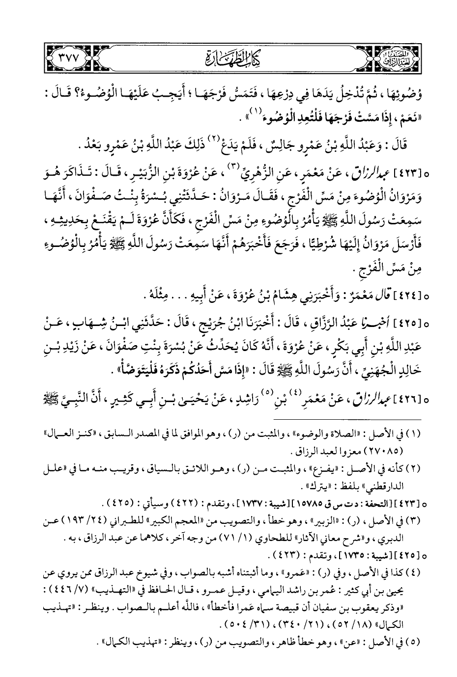 ° [٤٢٥] أخبرنا عَبْدُ الرَّزَّاقِ، قَالَ: أَخْبَرَنَا ابْنُ جُرَيْجٍ، قَالَ: حَدَّثَنِي ابْنُ شِهَابٍ، عَنْ عَبْدِ اللهِ بْنِ أَبِي بَكْرٍ، عَنْ عُرْوَةَ، أَنَّهُ كَانَ يُحَدِّثُ عَنْ بُسْرَةَ بِنْتِ صَفْوَانَ، عَنْ زَيْدِ بْنِ خَالِدٍ الْجُهَنِيِّ، أَنَّ رَسُولَ اللهِ - صلى الله عليه وسلم - قَالَ: "إِذَا مَسَّ أَحَدُكُمْ ذَكَرَهُ فَلْيَتَوَضَّأْ".