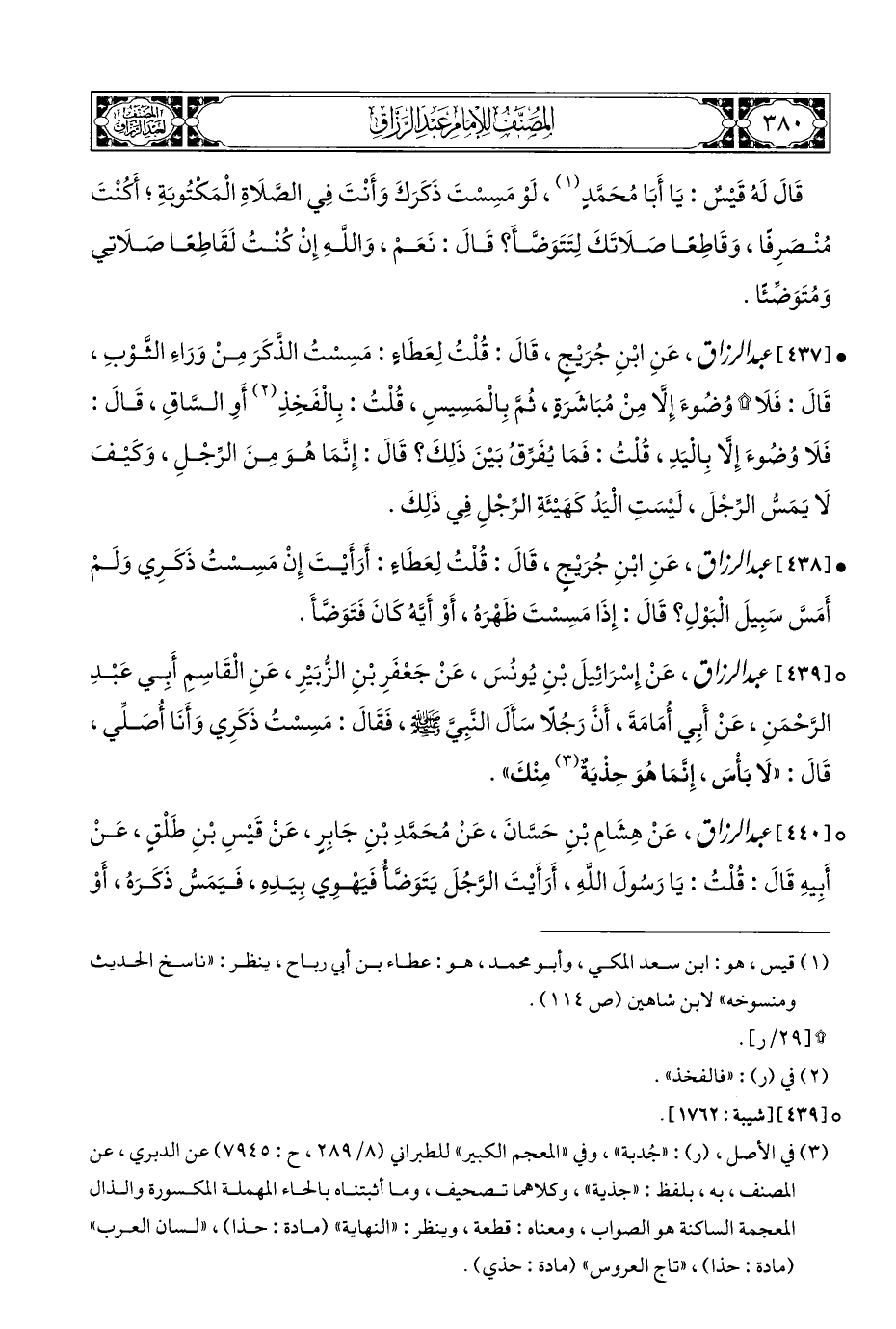 ° [٤٤٠] عبد الرزاق، عَنْ هِشَامِ بْنِ حَسَّانَ، عَنْ مُحَمَّدِ بْنِ جَابِرٍ، عَنْ قَيْسِ بْنِ طَلْقٍ، عَنْ أَبِيهِ قَالَ: قُلْتُ: يَا رَسُولَ اللهِ، أَرَأَيْتَ الرَّجُلَ يَتَوَضَّأُ فَيَهْوِي بِيَدِهِ، فَيَمَسُّ ذَكَرَهُ، أَوْ