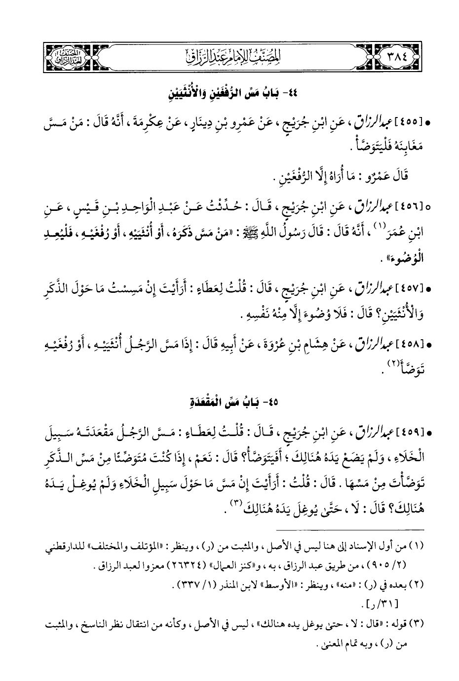 [٤٥٨] عبد الرزاق، عَنْ هِشَامِ بْنِ عُرْوَةَ، عَنْ أَبِيهِ قَالَ: إِذَا مَسَّ الرَّجُلُ أُنْثَيَيْهِ، أَوْ رُفْغَيْهِ تَوَضَّأَ (¬٢).