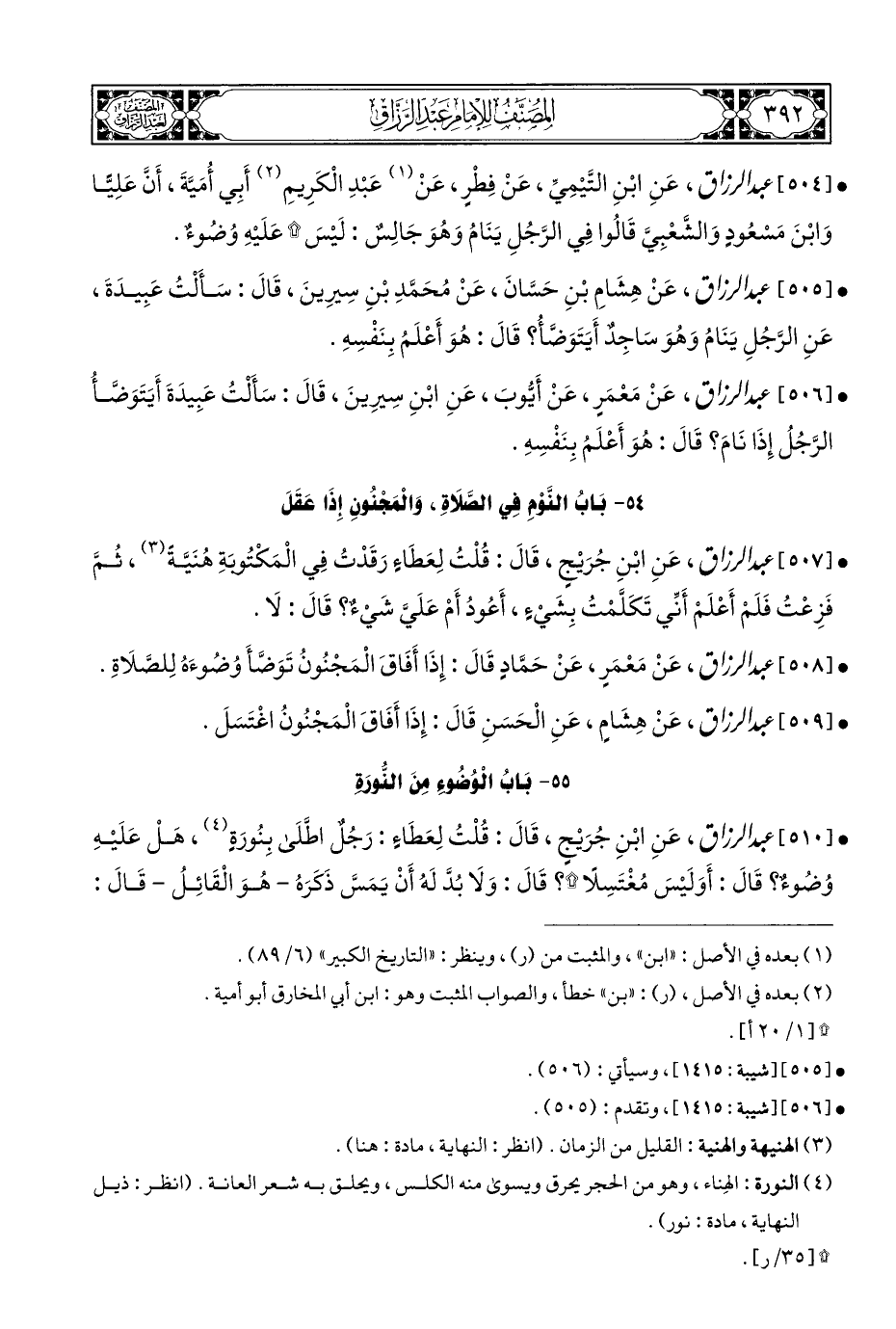 • [٥٠٨] عبد الرزاق، عَنْ مَعْمَرٍ، عَنْ حَمَّادٍ قَالَ: إِذَا أَفَاقَ الْمَجْنُونُ تَوَضَّأَ وُضُوءَهُ لِلصَّلَاةِ.