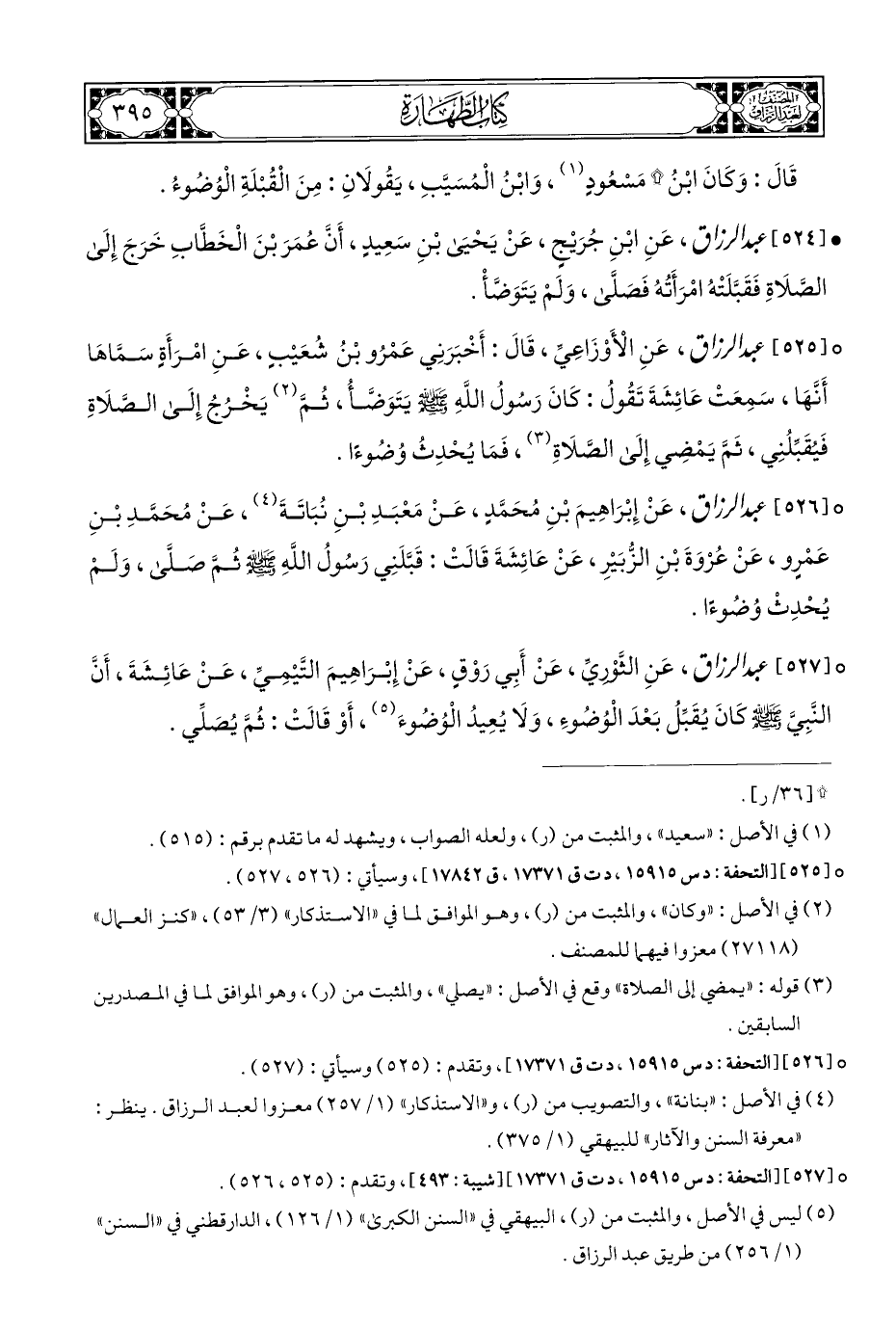 ° [٥٢٧] عبد الرزاق، عَنِ الثَّوْرِيِّ، عَنْ أَبِي رَوْقٍ، عَنْ إِبْرَاهِيمَ التَّيْمِيِّ، عَنْ عَائِشَةَ، أَنَّ النَّبِيَّ - صلى الله عليه وسلم - كَانَ يُقَبِّلُ بَعْدَ الْوُضُوءَ، وَلَا يُعِيدُ الْوُضُوءَ (¬٥)، أَوْ قَالَتْ: ثُمَّ يُصَلِّي.
