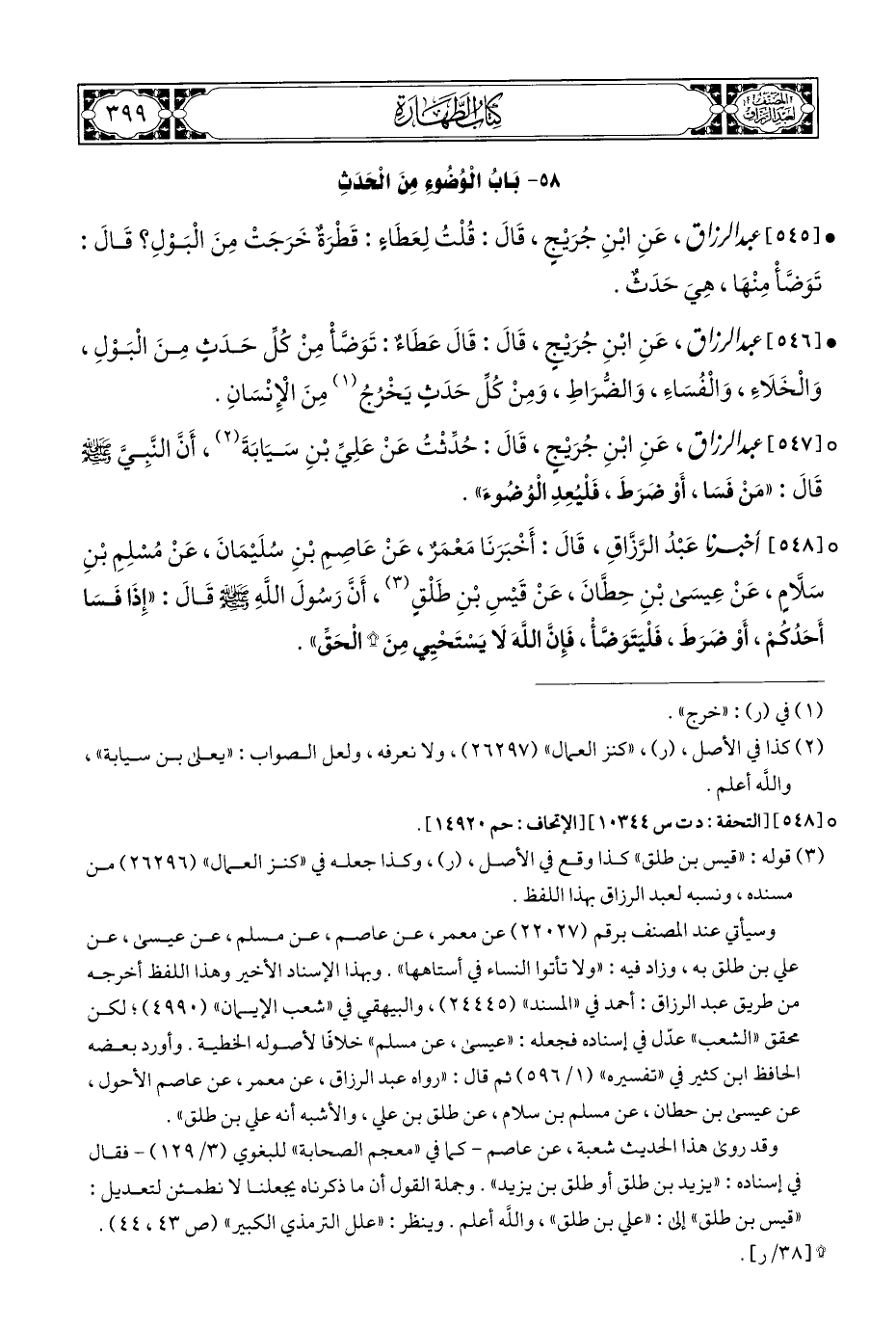 ° [٥٤٨] أخبرنا عَبْدُ الرَّزَّاقِ، قَالَ: أَخْبَرَنَا مَعْمَرٌ، عَنْ عَاصِمِ بْنِ سُلَيْمَانَ، عَنْ مُسْلِمِ بْنِ سَلَّامٍ، عَنْ عِيسَى بْنِ حِطَّانَ، عَنْ قَيْسِ بْنِ طَلْقٍ (¬٣)، أَنَّ رَسُولَ اللَّهِ - صلى الله عليه وسلم - قَالَ: "إِذَا فَسَا أَحَدُكُمْ، أَوْ ضَرَطَ، فَلْيَتَوَضَّأْ، فَإِنَّ اللهَ لَا يَسْتَحْيِي مِنَ * الْحَقِّ".