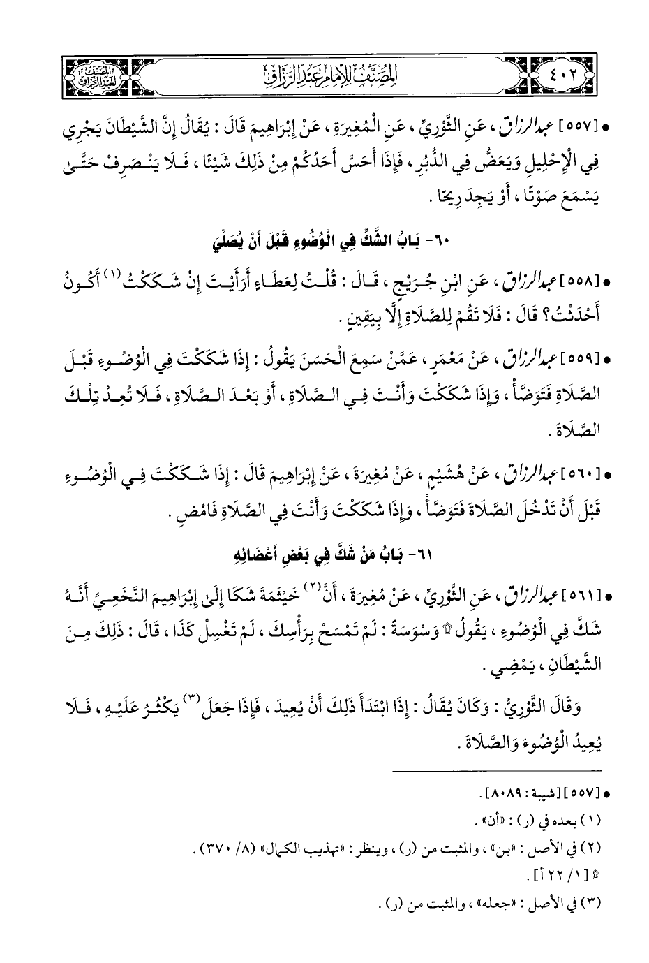 • [٥٦٠] عَبْد الرَّزَّاق، عَنْ هُشَيْمٍ، عَنْ مُغِيرَةَ، عَنْ إِبْرَاهِيمَ قَالَ: إِذَا شَكَكْتَ فِي الْوُضُوءِ قَبْلَ أَنْ تَدْخُلَ الصَّلَاةَ فَتَوَضَّأْ، وإِذَا شَكَكْتَ وَأَنْتَ فِي الصَّلَاةِ فَامْضِ.