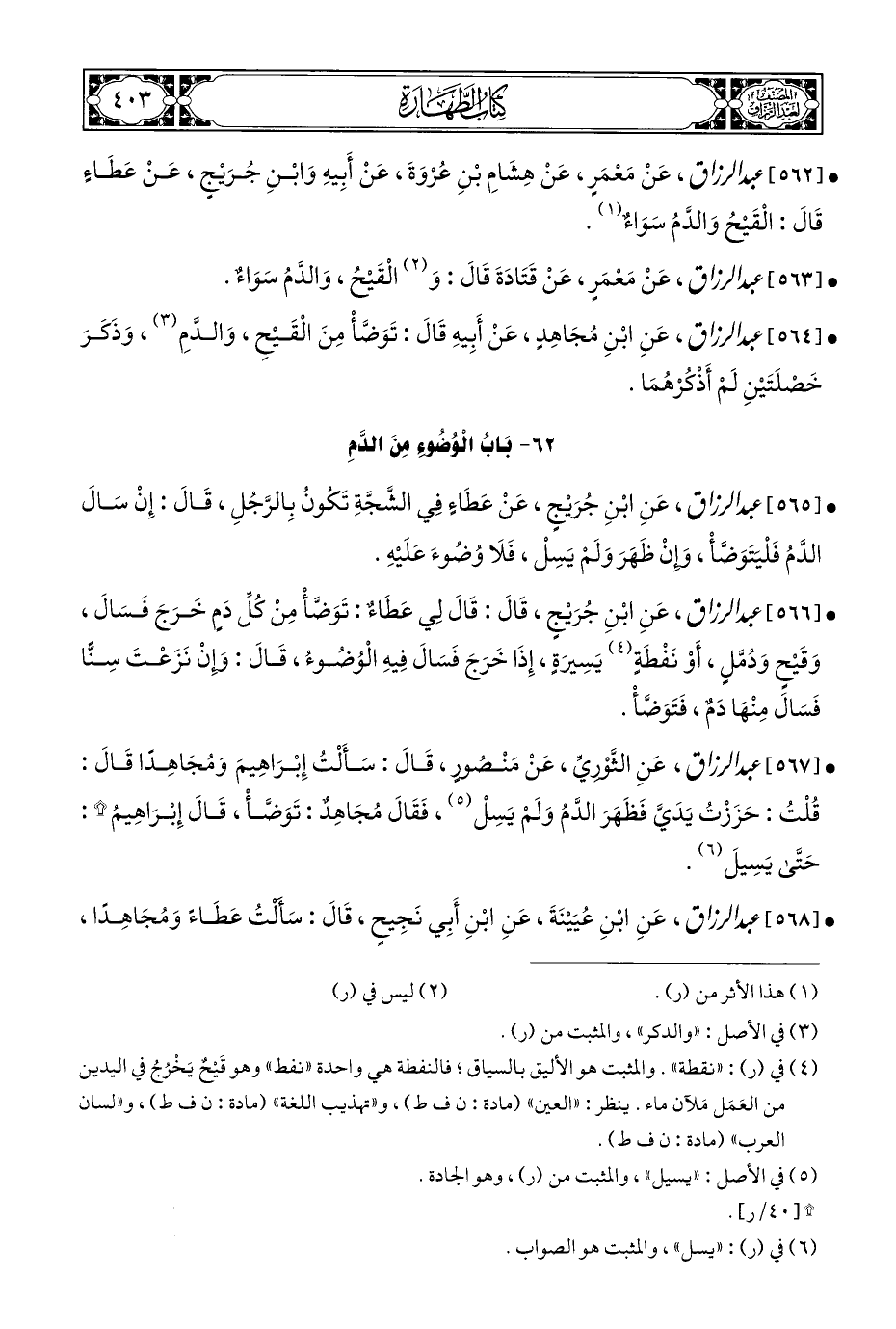 • [٥٦٢] عَبْد الرَّزَّاق، عَنْ مَعْمَرٍ، عَنْ هِشَامِ بْنِ عُرْوَةَ، عَنْ أَبِيهِ وَابْنِ جُرَيْجٍ، عَنْ عَطَاءٍ قَالَ: الْقَيْحُ وَالدَّمُ سَوَاءٌ (¬١).