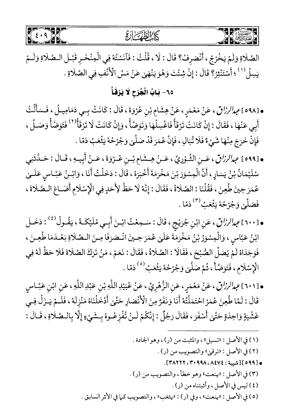 • [٥٩٨] عَبْد الرَّزَّاق، عَنْ مَعْمَرٍ، عَنْ هِشَامِ بْنِ عُرْوَةَ، قَالَ: كَانَتْ بِي دَمَامِيلُ، فَسَأَلْتُ أَبِي عَنْهَا، فَقَالَ: إِنْ كَانَتْ تَرْقَأُ فَاغْسِلْهَا وَتَوَضَّأْ، وإِنْ كَانَتْ لَا تَرْقَأُ (¬٢) فَتَوَضَّأْ وَصَلِّ، فَإِنْ خَرَجَ مِنْهَا شَيْءٌ فَلَا تُبَالِ، فَإِنَّ عُمَرَ قَدْ صَلَّى وَجُرْحُهُ يَثْعَبُ دَمًا.