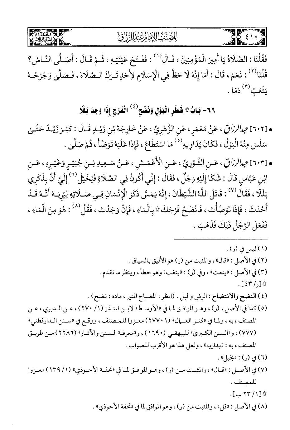 • [٦٠٣] عَبْد الرَّزَّاق، عَنِ الثَّوْريِّ، عَنِ الْأَعْمَشِ، عَنْ سَعِيدِ بْنِ جُبَيْرٍ وَغَيْرِهِ، عَنِ ابْنِ عَبُّاسٍ قَالَ: شَكَا إِلَيْهِ رَجُلٌ، فَقَالَ: إِنِّي أَكُونُ فِي الصَّلَاةِ فَيُخَيَّلُ (¬٦) إِلَيَّ أَنَّ بِذَكَرِي بَلَلًا، فَقَالَ (¬٧): قَاتَلَ اللَّهُ الشَّيْطَانَ، إِنَّهُ يَمَسُّ ذَكَرَ الْإِنْسَانِ فِي صَلَاتِهِ لِيُرِيَهُ أَنَّهُ قَدْ أَحْدَثَ، فَإِذَا تَوَضَّأتَ، فَانْضَحْ فَرْجَكَ * بِالْمَاءِ، فَإِنْ وَجَدْتَ، فَقُلْ (¬٨): هُوَ مِنَ الْمَاءِ، فَفَعَلَ الرَّجُلُ ذَلِكَ فَذَهَبَ.