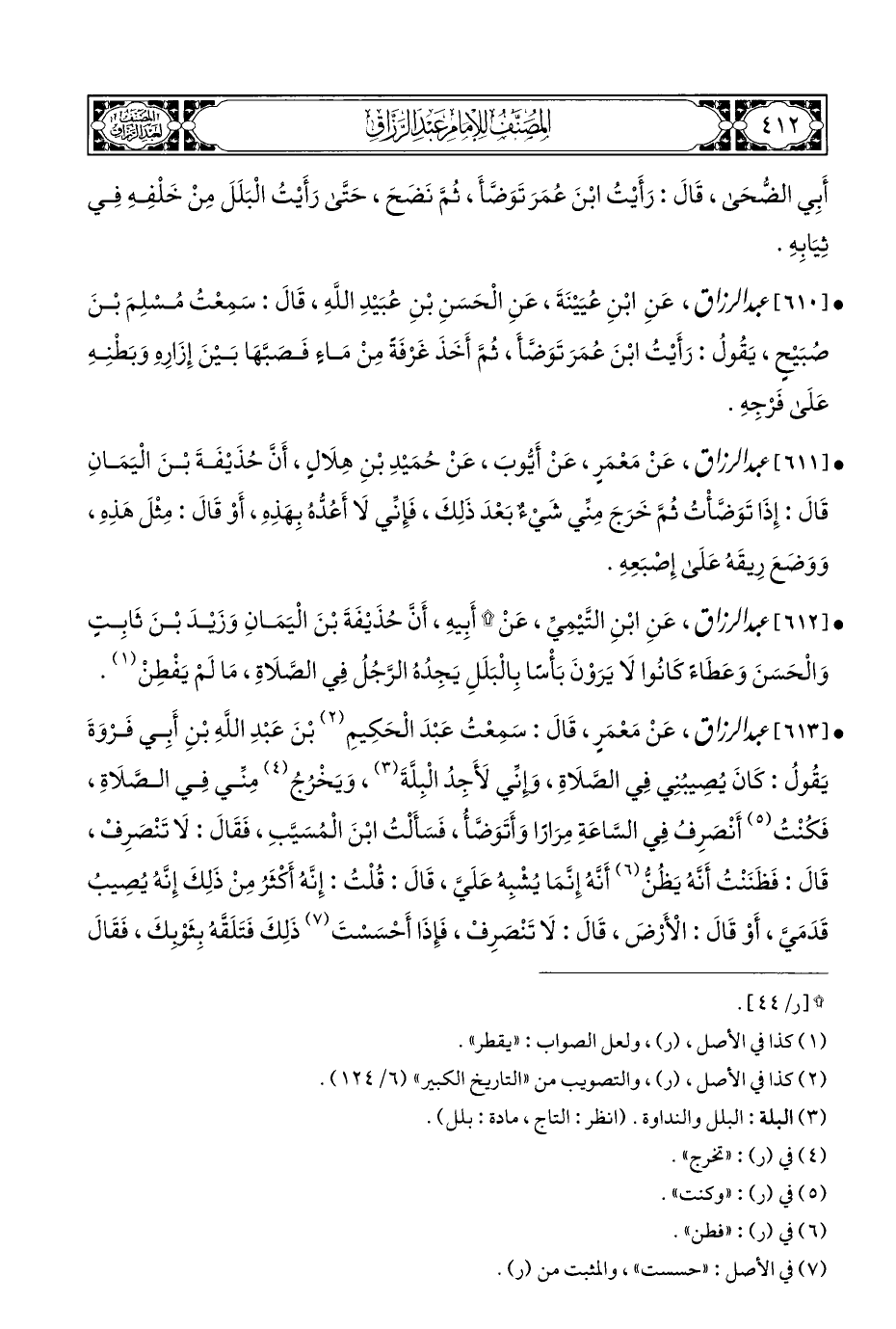 • [٦١٢] عَبْد الرَّزَّاق، عَنِ ابْنِ التَّيْمِيِّ، عَنْ * أَبِيهِ، أَن حُذَيْفَةَ بْنَ الْيَمَانِ وَزَيْدَ بْنَ ثَابِتٍ وَالْحَسَنَ وَعَطَاءً كَانُوا لَا يَرَوْنَ بَأْسًا بِالْبَلَلِ يَجِدُهُ الرَّجُلُ فِي الصَّلَاةِ، مَا لَمْ يَفْطِنْ (¬١).