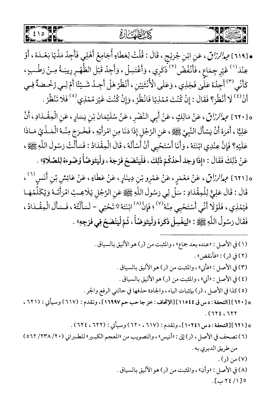 ° [٦٢٠] عَبْد الرَّزَّاق، عَنْ مَالِكٍ، عَنْ أَبِي النَّضْرِ، عَنْ سُلَيْمَانَ بْنِ يَسَارٍ، عَنِ الْمِقْدَادِ، أَنَّ عَلِيًّا، أَمَرَهُ أَنْ يَسْأَلَ النَّبِيَّ - صلى الله عليه وسلم -، عَنِ الرَّجُلِ إِذَا دَنَا مِنِ امْرَأَتِهِ، فَخَرَجَ مِنْهُ الْمَذْيُ مَاذَا عَلَيْهِ؟ فَإِنَّ عِنْدِي ابْنَتَهُ، وَأَنَا أَسْتَحْيِي أَنْ أَسْأَلَهُ، قَالَ الْمِقْدَادُ: فَسَأَلْتُ رَسُولَ اللَّهِ - صلى الله عليه وسلم -، عَنْ ذَلِكَ فَقَالَ: "إِذَا وَجَدَ أَحَدُكُمْ ذَلِكَ، فَلْيَنْضَحْ فَرْجَهُ، وَلْيَتَوَضَّأْ وُضُوءَهُ لِلصَّلَاةِ".