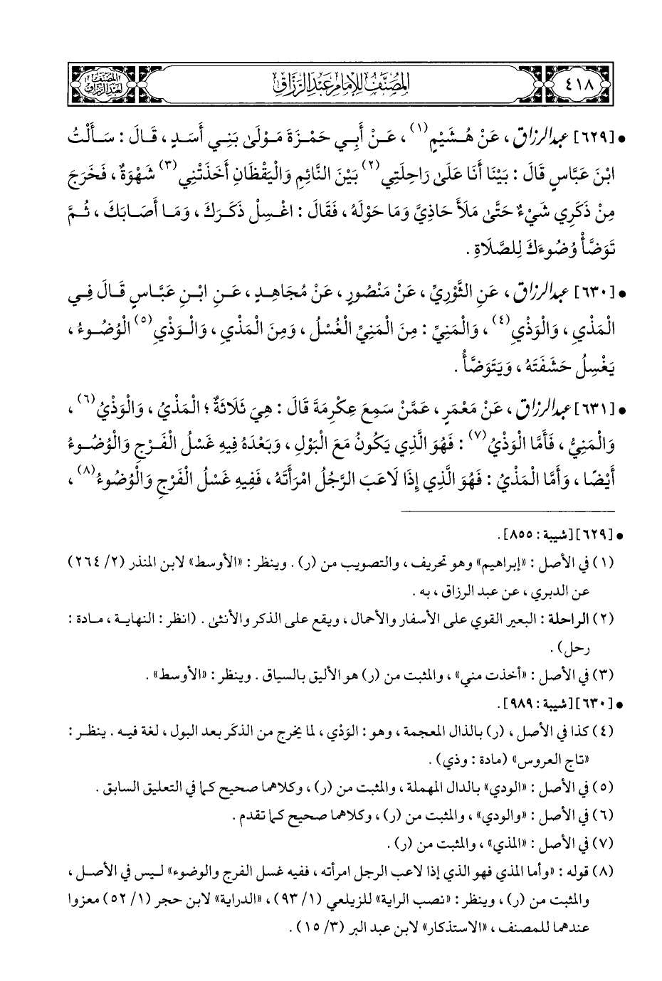 • [٦٢٩] عَبْد الرَّزَّاق، عَنْ هُشَيْمٍ (¬١)، عَنْ أَبِي حَمْزَةَ مَوْلَى بَنِي أَسَدٍ، قَالَ: سَأَلْتُ ابْنَ عَبَّاسٍ قَالَ: بَيْنَا أَنَا عَلَى رَاحِلَتِي (¬٢) بَيْنَ النَّائِمِ وَالْيَقْظَانِ أَخَذَتْنِي (¬٣) شَهْوَةٌ، فَخَرَجَ مِنْ ذَكَرِي شَيْءٌ حَتَّى مَلأَ حَاذِيَّ وَمَا حَوْلَهُ، فَقَالَ: اغْسِلْ ذَكَرَكَ، وَمَا أَصَابَكَ، ثُمَّ تَوَضَّأْ وُضُوءَكَ لِلصَّلَاةِ.