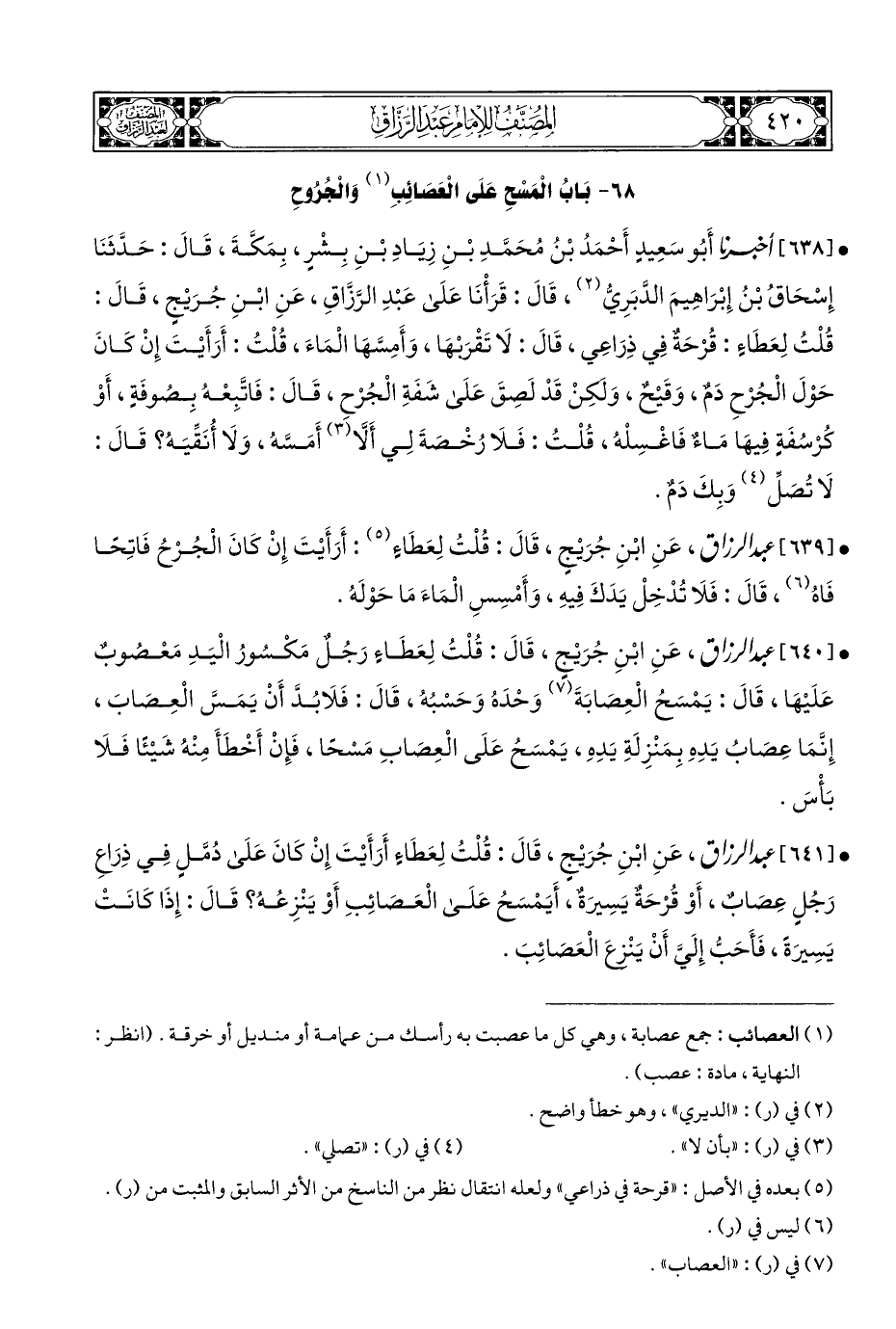 • [٦٣٨] أخبرنا أَبُو سَعِيدٍ أَحْمَدُ بْنُ مُحَمَّدِ بْنِ زِيَادِ بْنِ بِشْرٍ، بِمَكَةَ، قَالَ: حَدَّثَنَا إِسْحَاقُ بْنُ إِبْرَاهِيمَ الدَّبَرِيُّ (¬٢)، قَالَ: قَرَأْنَا عَلَى عَبْدِ الرَّزَّاقِ، عَنِ ابْنِ جُرَيْجٍ، قَالَ: قُلْتُ لِعَطَاءٍ: قُرْحَةٌ فِي ذِرَاعِي، قَالَ: لَا تَقْرَبْهَا، وَأَمِسَّهَا الْمَاءَ، قُلْتُ: أَرَأَيْتَ إِنْ كَانَ حَوْلَ الْجُرْحِ دَمٌ، وَقَيْحٌ، وَلكِنْ قَدْ لَصِقَ عَلَى شَفَةِ الْجُرْح، قَالَ: فَاتَّبِعْهُ بِصُوفَةٍ، أَوْ كُرْسُفَةٍ فِيهَا مَاءٌ فَاغْسِلْهُ، قُلْتُ: فَلَا رُخْصَةَ لِي أَلَّا (¬٣) أَمَسَّهُ، وَلَا أُنَقِّيَهُ؟ قَالَ: لَا تُصلِّ (¬٤) وَبِكَ دَمٌ.