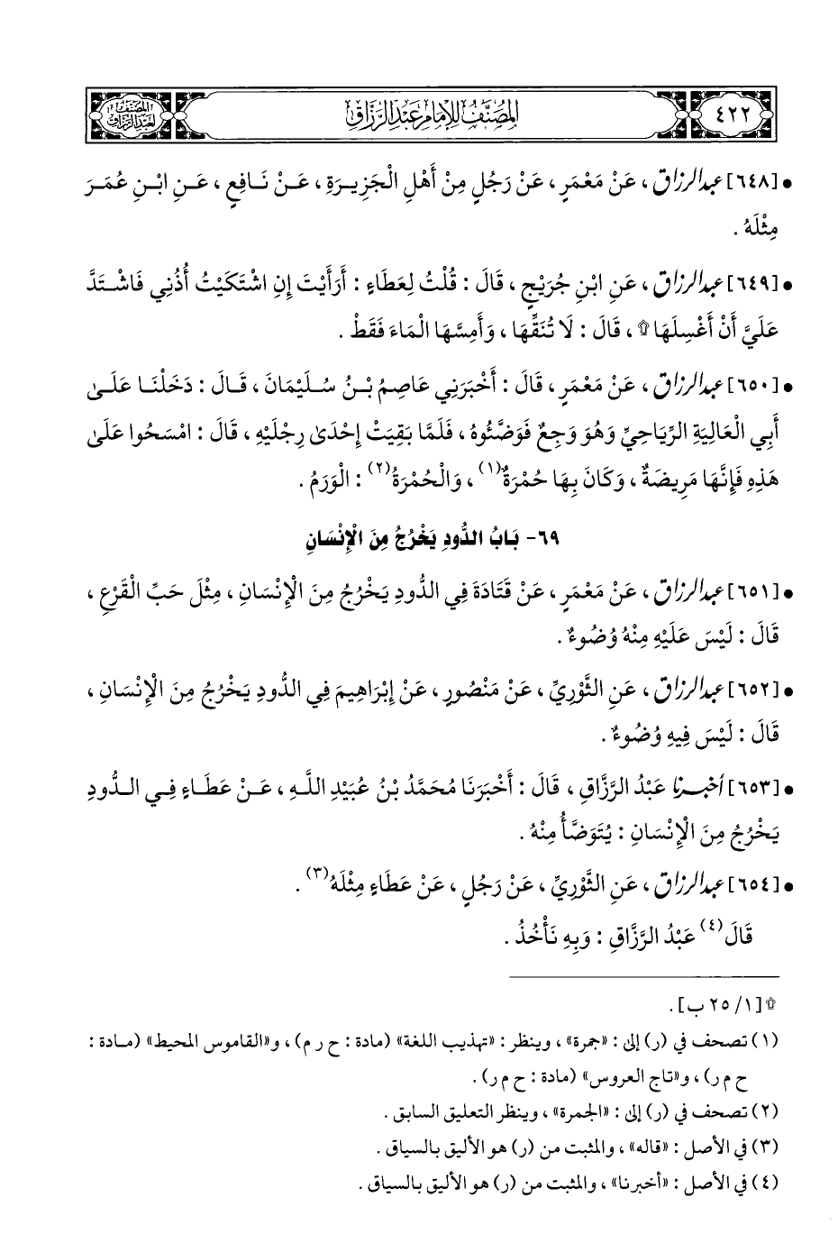 • [٦٥٢] عَبْد الرَّزَّاق، عَنِ الثَّوْرِيِّ، عَنْ مَنْصُورٍ، عَنْ إِبْرَاهِيمَ فِي الدُّودِ يَخْرُجُ مِنَ الْإِنْسَانِ، قَالَ: لَيْسَ فِيهِ وُضُوءٌ.