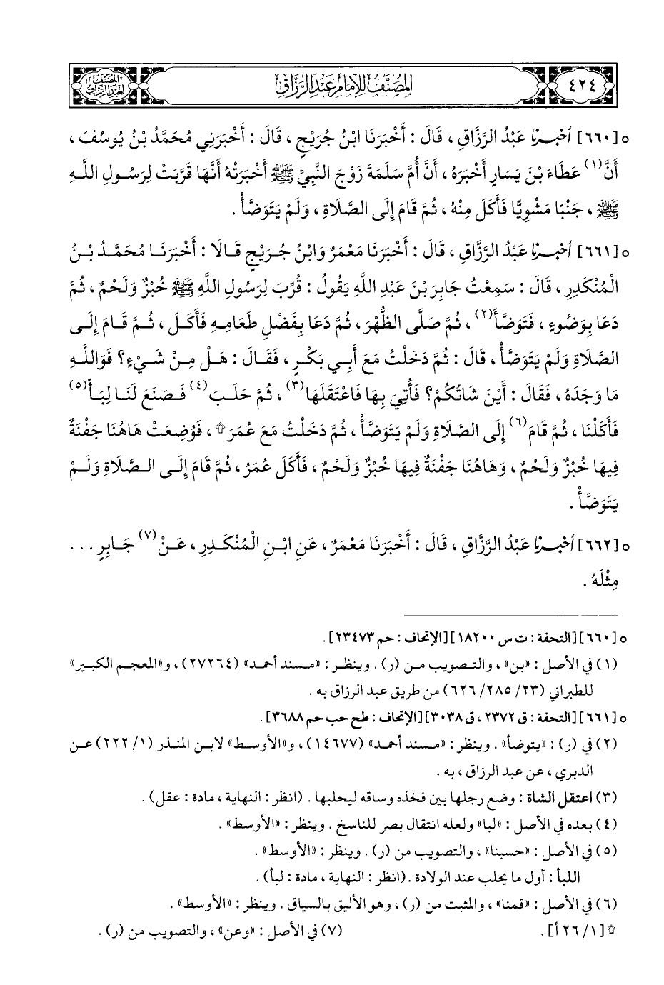 ° [٦٦١] أَخْبَرَنَا عَبْدُ الرَّزَّاقِ، قَالَ: أَخْبَرَنَا مَعْمَرٌ وَابْنُ جُرَيْجٍ قَالَا: أَخْبَرَنَا مُحَمَّدُ بْنُ الْمُنْكَدِرِ، قَالَ: سَمِعْتُ جَابِرَ بْنَ عَبْدِ اللَّهِ يَقُولُ: قُرِّبَ لِرَسُولِ اللَّهِ - صلى الله عليه وسلم - خُبْزٌ وَلَحْمٌ، ثُمَّ دَعَا بِوَضُوءٍ، فَتَوَضَّأَ (¬٢)، ثُمَّ صلَّى الظُّهْرَ، ثُمَّ دَعَا بِفَضلِ طَعَامِهِ فَأَكَلَ، ثُمَّ قَامَ إِلَى الصَّلَاةِ وَلَمْ يَتَوَضَّأْ، قَالَ: ثُمَّ دَخَلْتُ مَعَ أَبِي بَكْرٍ، فَقَالَ: هَلْ مِنْ شَيءٍ؟ فَوَاللَّهِ مَا وَجَدَهُ، فَقَالَ: أَيْنَ شَاتُكُمْ؟ فَأُتِيَ بِهَا فَاعْتَقَلَهَا (¬٣)، ثُمَّ حَلَبَ (¬٤) فَصَنَعَ لَنَا لِبَأً (¬٥) فَأَكَلْنَا، ثُمَّ قَامَ (¬٦) إِلَى الصَّلَاةِ وَلَمْ يَتَوَضَّأْ، ثُمَّ دَخَلْتُ مَعَ عُمَرَ *، فَوُضِعَتْ هَاهُنَا جَفْنَةٌ فِيهَا خُبْزٌ وَلَحْمٌ، وَهَاهُنَا جَفْنَةٌ فِيهَا خُبْزٌ وَلَحْمٌ، فَأَكَلَ عُمَرُ، ثُمَّ قَامَ إِلَى الصَّلَاةِ وَلَمْ يَتَوَضَّأ.