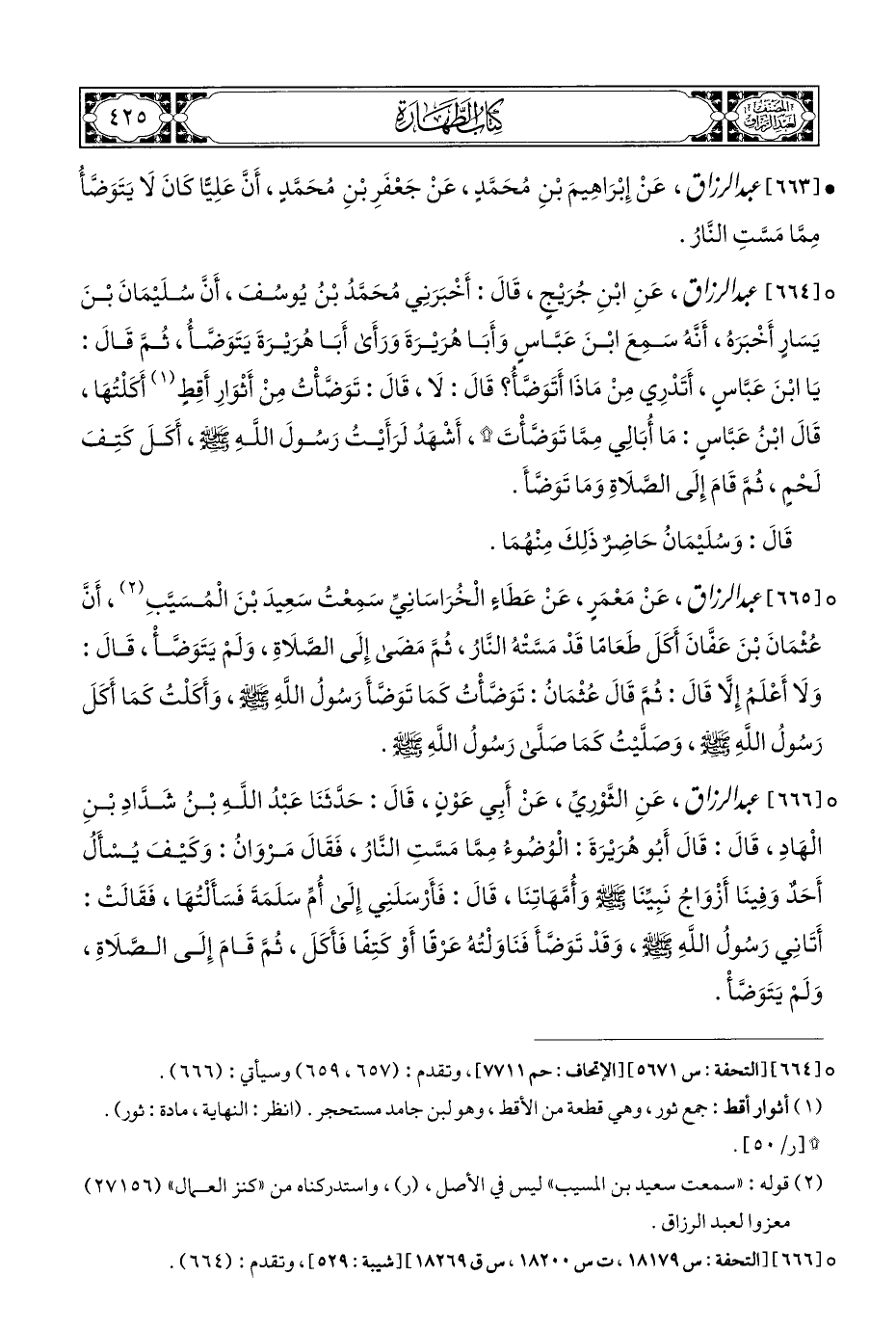 ° [٦٦٥] عبد الرزاق، عَنْ مَعْمَرٍ، عَنْ عَطَاءٍ الْخُرَاسَانِيِّ سَمِعْتُ سَعِيدَ بْنَ الْمُسَيَّبِ (¬٢)، أَنَّ عُثْمَانَ بْنَ عَفَّانَ أكَلَ طَعَامًا قَدْ مَسَّتْهُ النَّارُ، ثُمَّ مَضَى إِلَى الصَّلَاةِ، وَلَمْ يَتَوَضَّأ، قَالَ: وَلَا أَعْلَمُ إِلَّا قَالَ: ثُمَّ قَالَ عُثْمَانُ: تَوَضَّأْتُ كَمَا تَوَضَّأَ رَسُولُ اللَّهِ - صلى الله عليه وسلم -، وَأَكَلْتُ كَمَا أَكَلَ رَسُولُ اللَّهِ - صلى الله عليه وسلم -، وَصلَّيْتُ كَمَا صَلَّى رَسُولُ اللَّهِ - صلى الله عليه وسلم -.