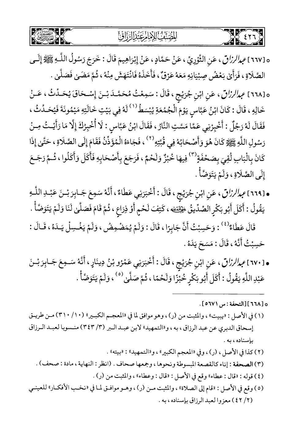 ° [٦٦٧] عبد الرزاق عَنِ الثَّوْرِيِّ، عَنْ حَمَّادٍ، عَنْ إِبْرَاهِيمَ قَالَ: خَرَجَ رَسُولُ اللَّهِ - صلى الله عليه وسلم - إِلَى الصَّلَاةِ، فَرَأَى بَعْضُ صِبْيَانِهِ مَعَهُ عَرْقٌ، فَأَخَذَهُ فَانْتَهَشَ مِنْهُ، ثُمَّ مَضى فَصَلَّى.