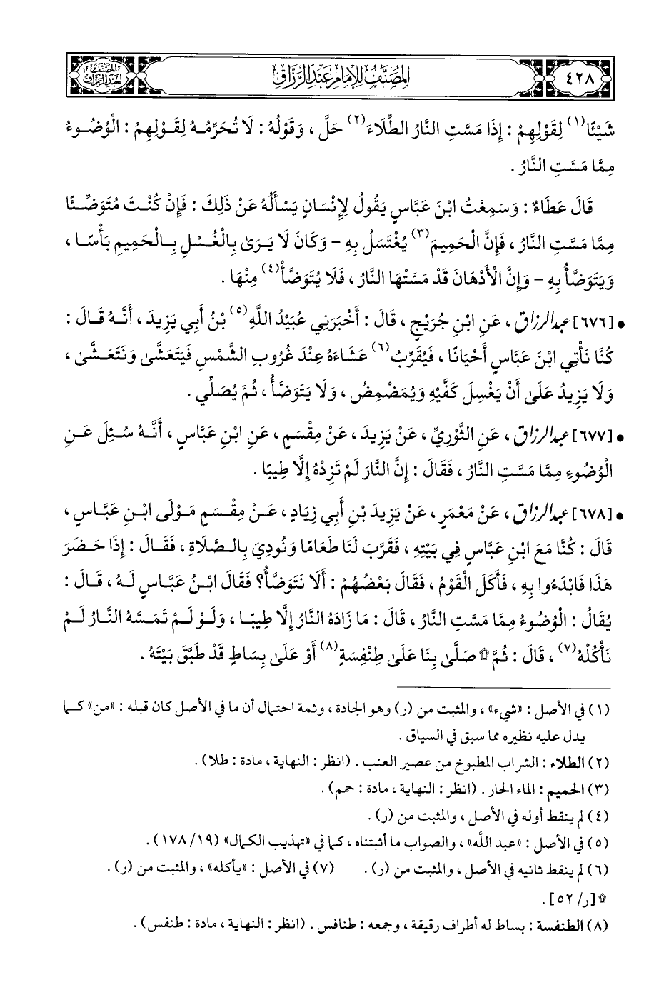 • [٦٧٨] عبد الرزاق، عَنْ مَعْمَرٍ، عَنْ يَزِيدَ بْنِ أَبِي زِيَادٍ، عَنْ مِقْسَمٍ مَوْلَى ابْنِ عَبَّاسٍ، قَالَ: كُنَّا مَعَ ابْنِ عَبَّاسٍ فِي بَيْتِهِ، فَقَرَّبَ لَنَا طَعَامًا وَنُودِيَ بِالصلَاةِ، فَقَالَ: إِذَا حَضَرَ هَذَا فَابْدَءُوا بِهِ، فَأَكَلَ الْقَوْمُ، فَقَالَ بَعْضُهُمْ: أَلَا نَتَوَضَّأُ؟ فَقَالَ ابْنُ عَبَّاسٍ لَهُ، قَالَ: يُقَالُ: الْوُضُوءُ مِمَّا مَسَّتِ النَّارُ، قَالَ: مَا زَادَهُ النَّارُ إِلَّا طِيبًا، وَلَوْ لَمْ تَمَسَّهُ النَّارُ لَمْ نَأْكُلْهُ (¬٧)، قَالَ: ثُمَّ * صَلَّى بِنَا عَلَى طِنْفِسَةٍ (¬٨) أَوْ عَلَى بِسَاطٍ قَدْ طَبَّقَ بَيْتَهُ.