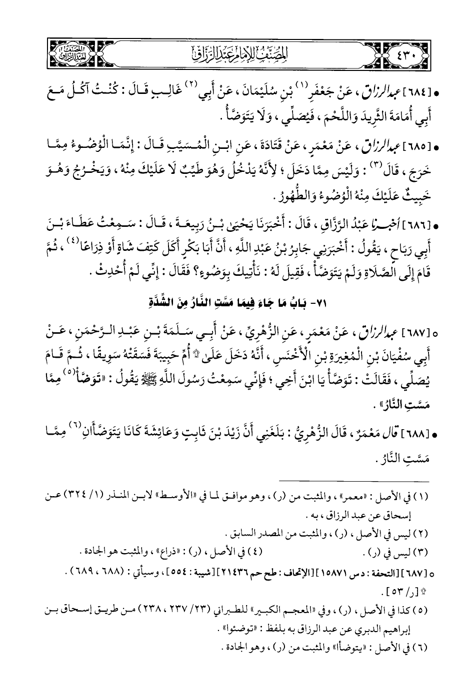 • [٦٨٨] قال مَعْمَرٌ، قَالَ الزُّهْرِيُّ: بَلَغَنِي أَنَّ زَيْدَ بْنَ ثَابِتٍ وَعَائِشَةَ كَانَا يَتَوَضَّأَانِ (¬٦) مِمَّا مَسَّتِ النَّارُ.