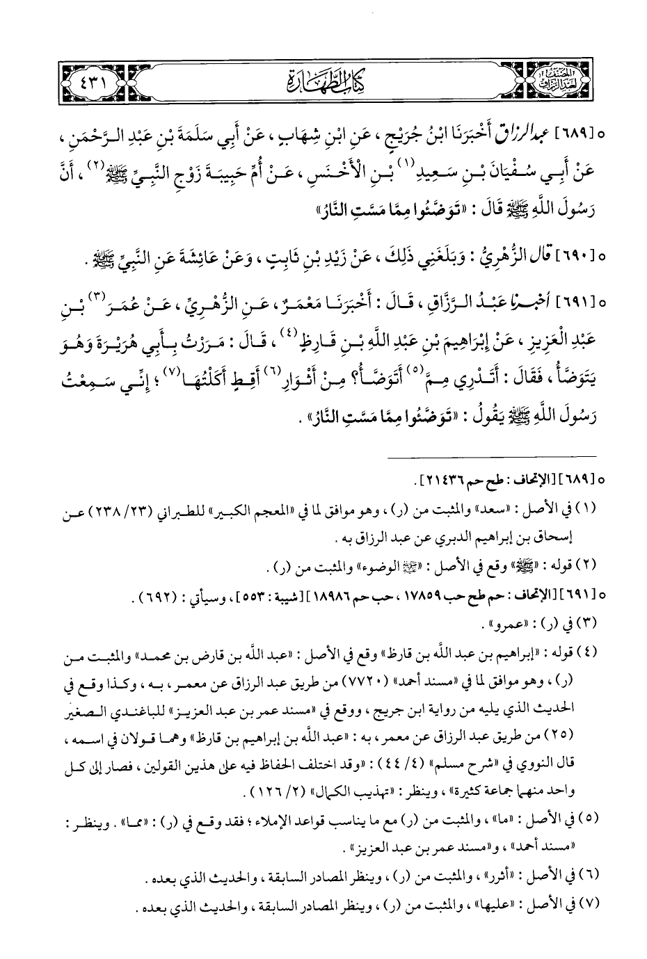 ° [٦٨٩] عبد الرزاق، أَخْبَرَنَا ابْنُ جُرَيْجٍ، عَنِ ابْنِ شِهَابٍ، عَنْ أَبِي سَلَمَةَ بْنِ عَبْدِ الرَّحْمَنِ، عَنْ أَبِي سُفْيَانَ بْنِ سَعِيدِ (¬١) بْنِ الْأَخْنَسِ، عَنْ أُمِّ حَبِيبَةَ زَوْجِ النَّبِيِّ - صلى الله عليه وسلم - (¬٢)، أَنَّ رَسُولَ اللَّهِ - صلى الله عليه وسلم - قالَ: "تَوَضَّئُوا مِمَّا مَسَّتِ النَّارُ".