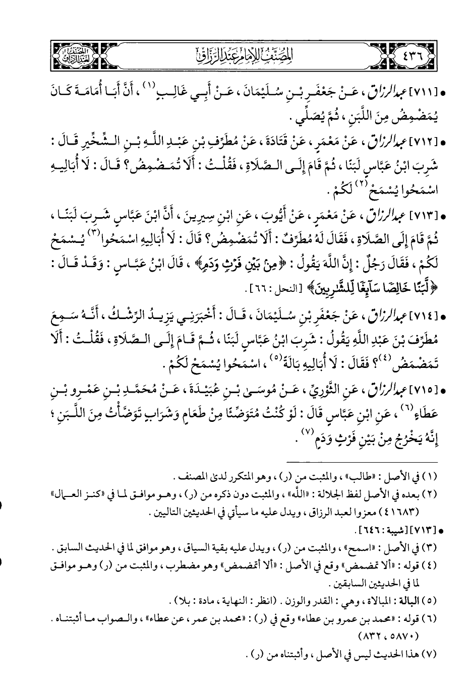 • [٧١٢] عبد الرزاق، عَنْ مَعْمَرٍ، عَنْ قَتَادَةَ، عَنْ مُطَرِّفِ بْنِ عَبْدِ اللَّهِ بْنِ الشِّخِّيرِ قَالَ: شَرِبَ ابْنُ عَبَّاسٍ لَبَنَا، ثُمَّ قَامَ إِلَى الصَّلَاةِ، فَقُلْتُ: أَلَا تُمَضْمِضُ؟ قَالَ: لَا أُبَالِيهِ اسْمَحُوا يُسْمَحْ (¬٢) لكُمْ.